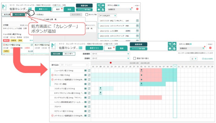 薬局の調剤業務においては、患者さん一人ひとりの服薬状況を正しく把握する必要があります。中でも、定期的に通院服薬をされている患者さんの場合、前回処方と今回処方で服薬期間が重複することで、重複投薬や薬効の重複、副作用発生などのリスクがあります。従来の処方画面に加え、患者さんの処方歴と薬効重複を一覧表示させ、必要に応じて薬歴を参照できる「カレンダー機能」を提供することで、薬局の処方監査の効率化を支援していく考えです。