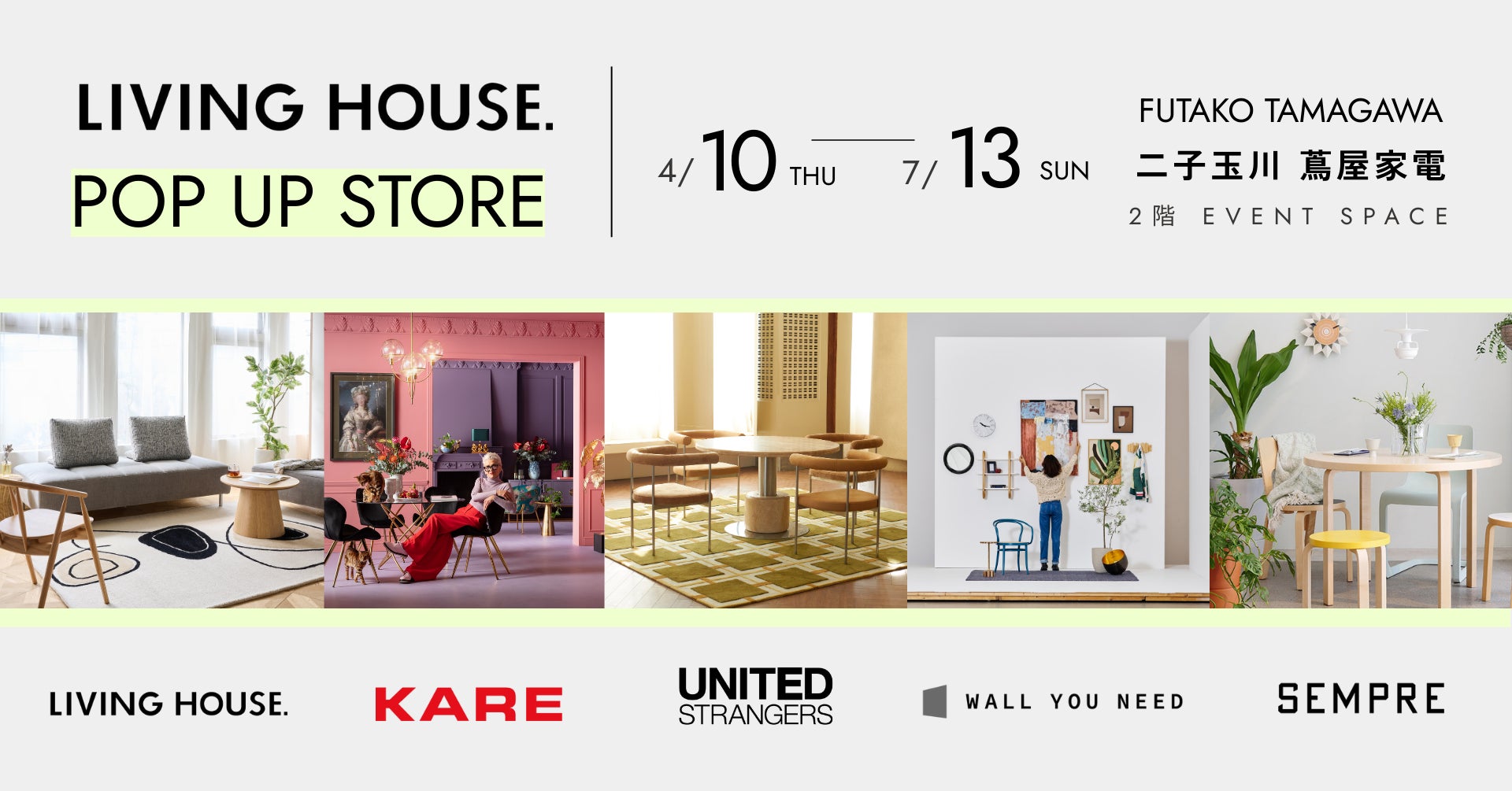 本ポップアップストアでは、LIVING HOUSE.(リビングハウス)の定番人気アイテムはもちろん、ユニークなアイテムでSNSでも話題の「KARE(カレ)」や、新ブランド「UNITED STRANGERS(ユナイテッド ストレンジャーズ)」、今回が実店舗初お披露目となる壁インテリア専門ブランド「WALL YOU NEED(ウォールユーニード)」、そして昨年横浜ベイクォーター店で当社とセンプレデザインがコラボレーションした新業態「/SEMPRE(スラッシュ センプレ)」のインショップ2号店など、当社の最新ブランドが一堂に集結いたします。約90坪の広々とした空間で、当社が提案する新たなライフスタイルとインテリアの魅力を、ぜひこの機会にお楽しみください。