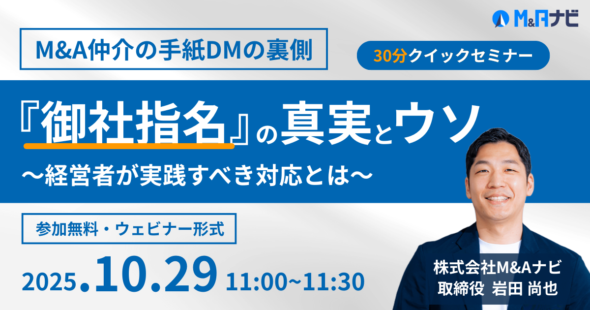 【10/29開催|無料セミナー】M&A仲介の手紙DMの裏側:『御社指名』の真実とウソを開催いたします。