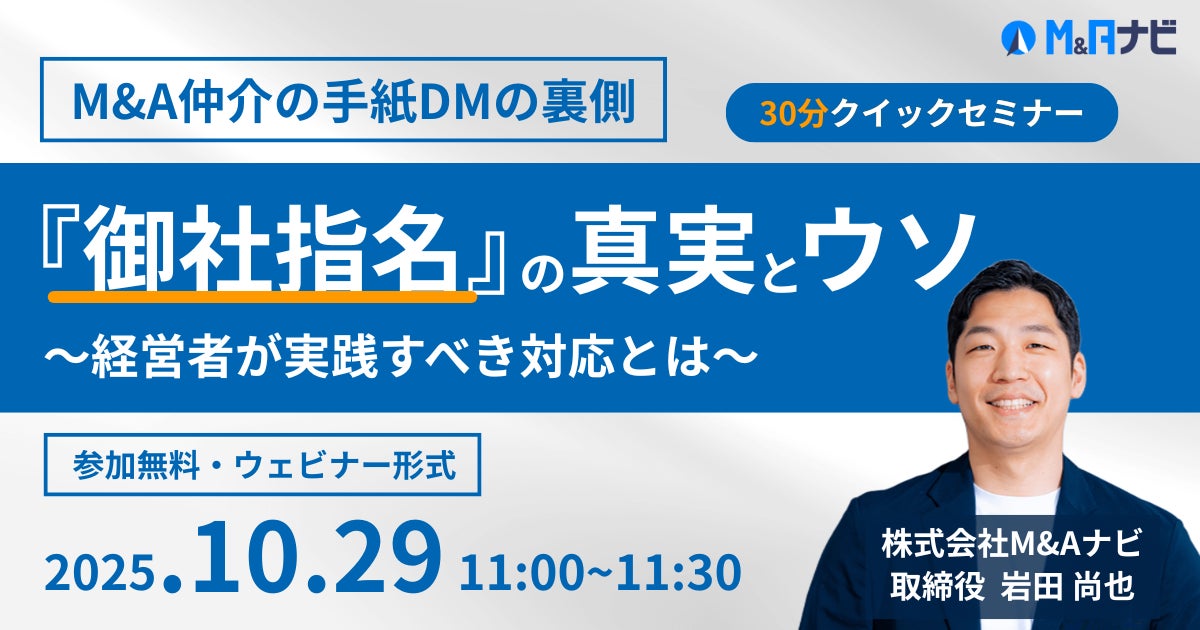 M&Aテクノロジーを展開する株式会社M&Aナビ(本社:東京都品川区、代表取締役:瀧田 雄介、以下「当社」)は、M&A仲介の手紙DMの営業手法の詳細と経営者の皆様が取るべき対応を解説するセミナーを2025年10月29日(水)11時00分から開催いたします。