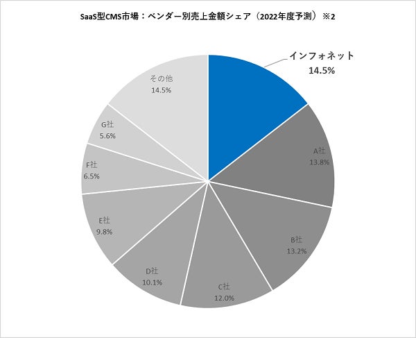 オールインワン商用コンテンツ管理システム「infoCMS」を提供する株式会社インフォネット(本社:東京都千代田区、代表取締役社長執行役員 日下部拓也、証券コード:4444、以下「当社」)は、株式会社アイ・ティ・アール(以下、ITR)が発行した市場調査レポート『ITR Market View:ECサイト構築/CMS/SMS送信サービス/電子請求書サービス市場2022』の「SaaS型CMS市場のベンダー別売上金額推移およびシェア」において7年連続No.1※1を獲得しました。