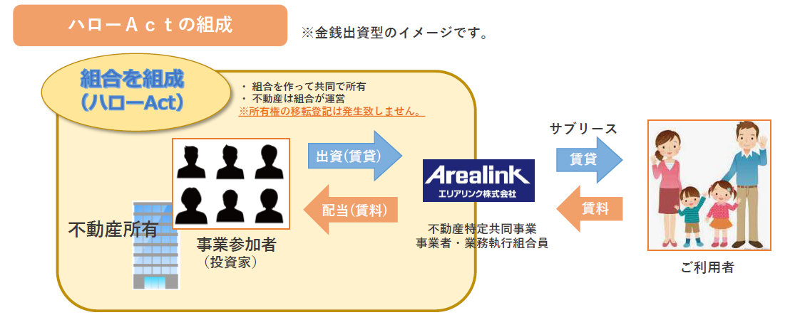 「ハローAct」は、一棟型のトランクルーム「ハローストレージ」の所有権を1口1000万円に小口化することで、少額で不動産権利を取得できる商品です。任意組合を組成し、共同で不動産を所有、エリアリンクが事業者となって運営します。小口化でも不動産の投資と変わりなく、不動産所得として配当を得ることができます。