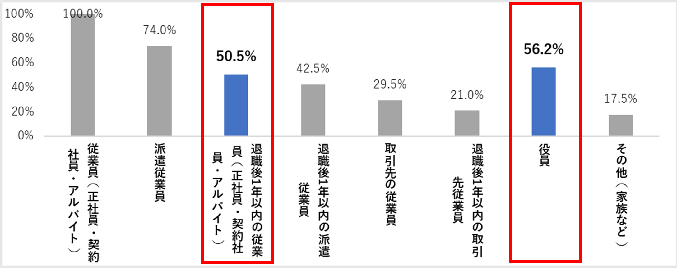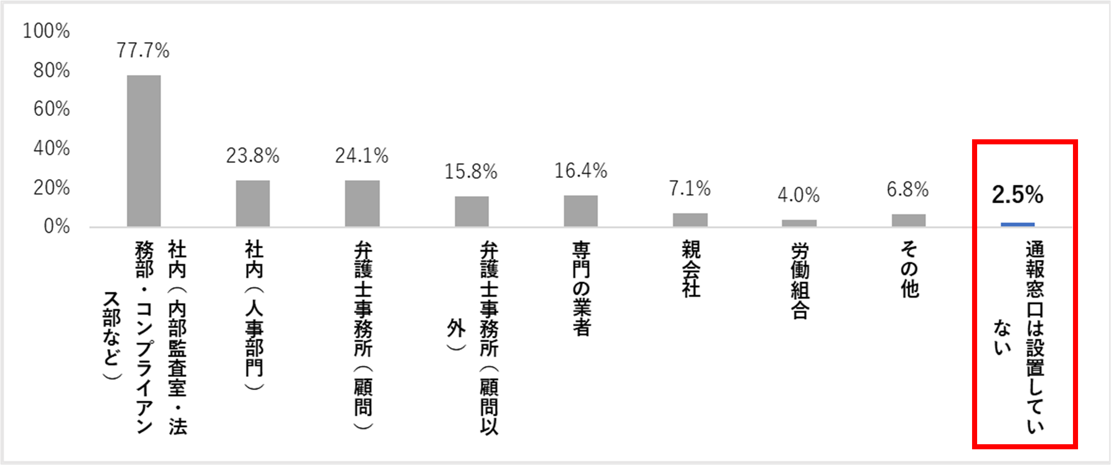 - 約半数の企業が、退職1年以内の従業員(派遣社員含む)の内部通報窓口が未設置
