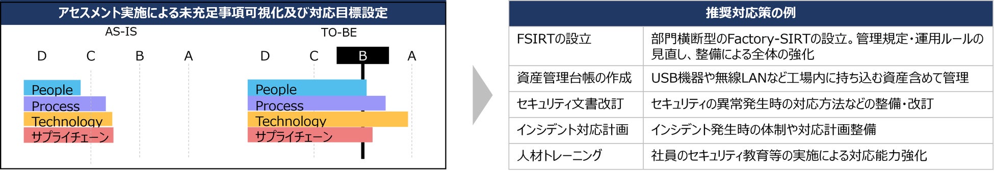 アセスメントを通じて、セキュリティ上の課題とリスクを可視化し、優先的に対処すべきポイントを明確化することで、効果的なセキュリティ対応力強化を実現します。