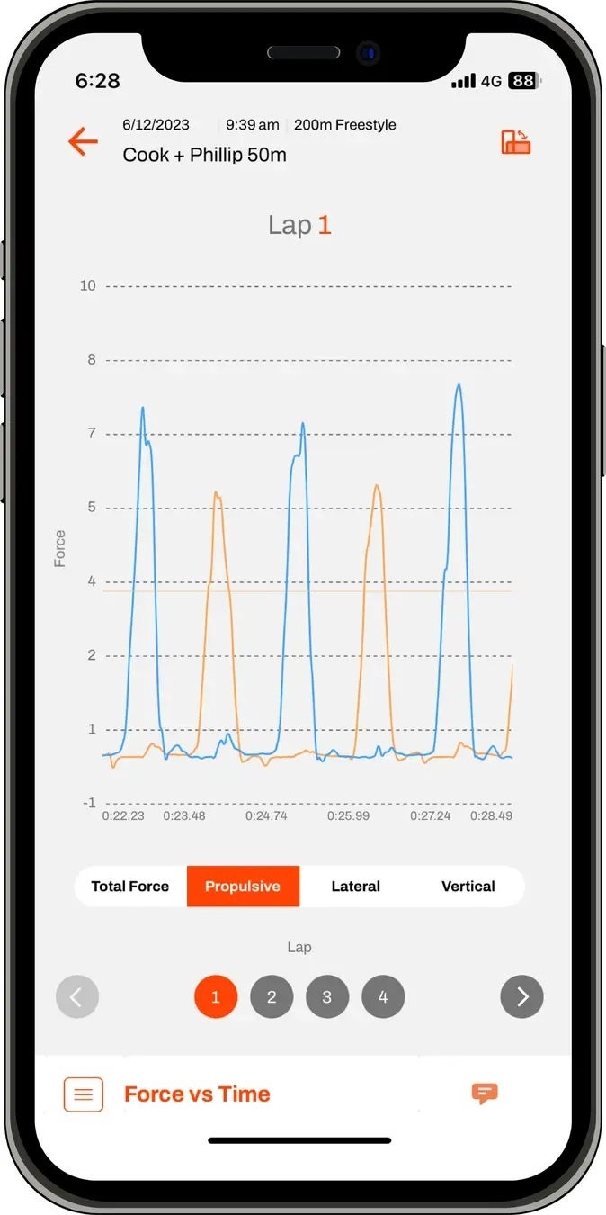 スイマーとそのコーチが、スイムのあらゆる瞬間に何が起きているのかを正確に理解できるよう、7種類のチャートが用意されています。