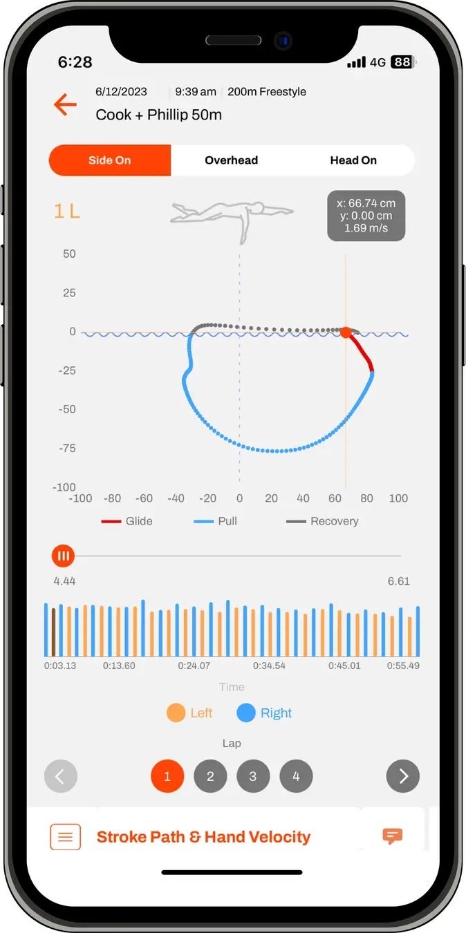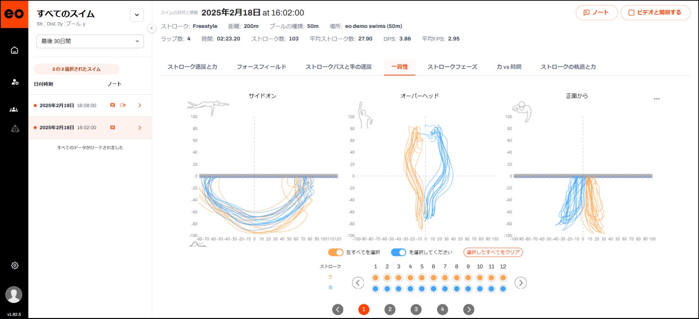 データからは、左右ストロークの差、インスイープやアウトスイープによって推進力を奪っている箇所、疲労に伴ってストロークがどのように変化するかなど、自身の泳ぎを詳細に確認できます。これらのデータはすべて、ラップごと、あるいはストロークごとに見ることができ、さらにビデオと同期することで実際の手の動きを見ながら改善点を簡単に確認することも可能です。訓練された経験豊富な目や、優れた感覚を持つスイマーでさえ、eo SwimBETTERが提供する正確なデータと洞察にはかないません。
