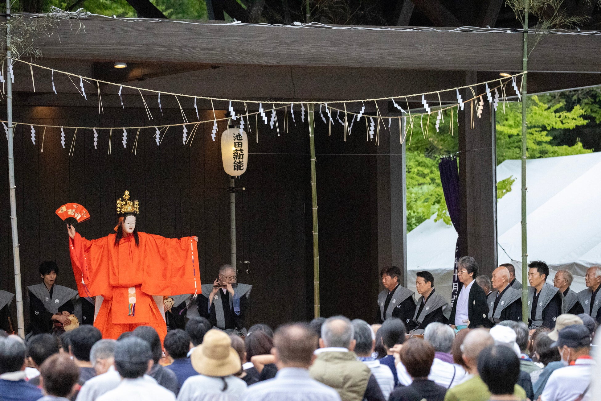 今回はその中から、日本の国造りを示し舞台の区画を定める田楽「烏とび」と、織女が機(はた)を織って帝に献上し祝い寿ぐ能舞「呉服(くれは)」を上演。本来の神事とは真逆の季節、演者たちは暑さをものともせず、池田町が誇る伝統の舞を大観衆の前で披露しました。