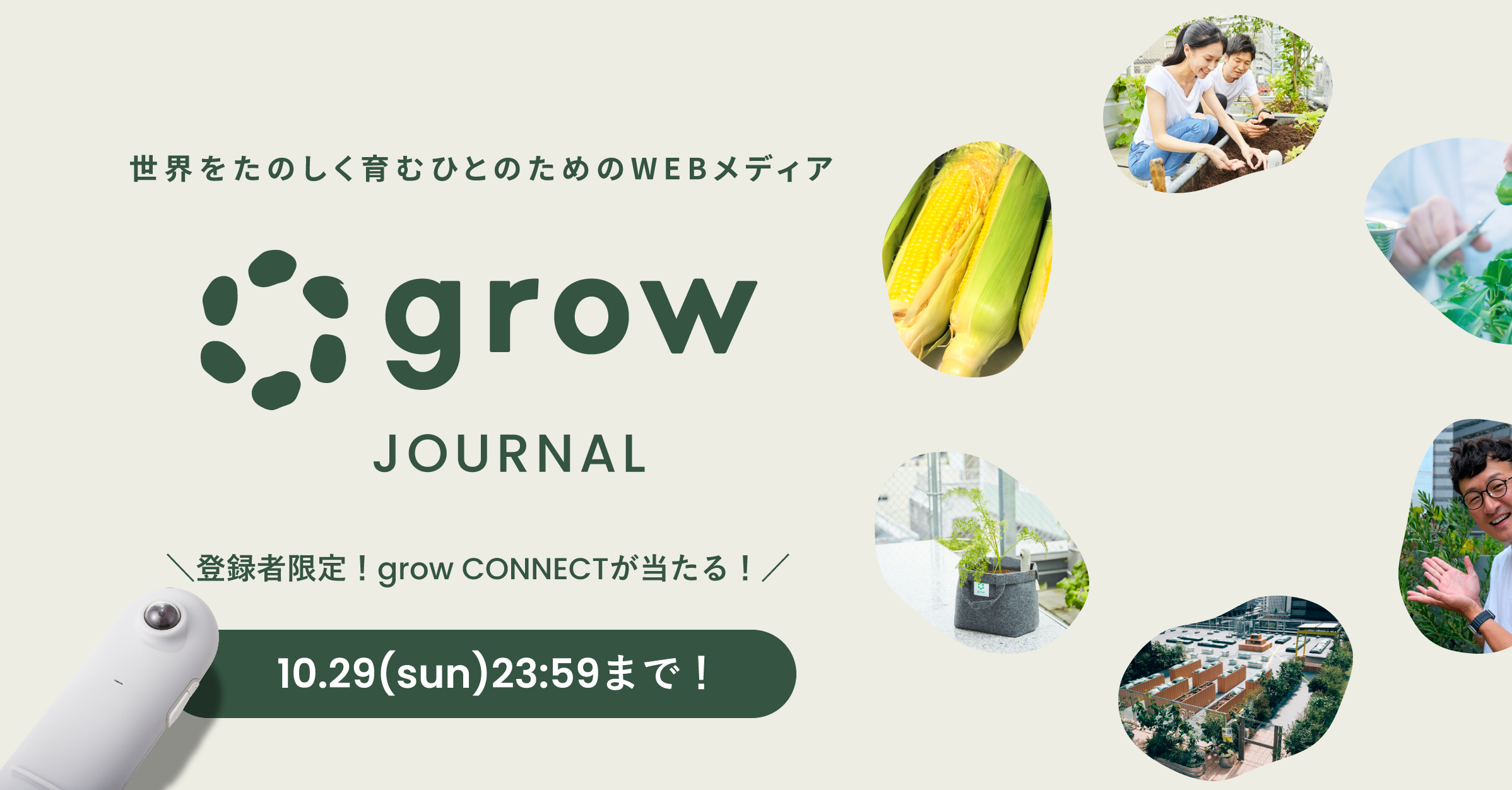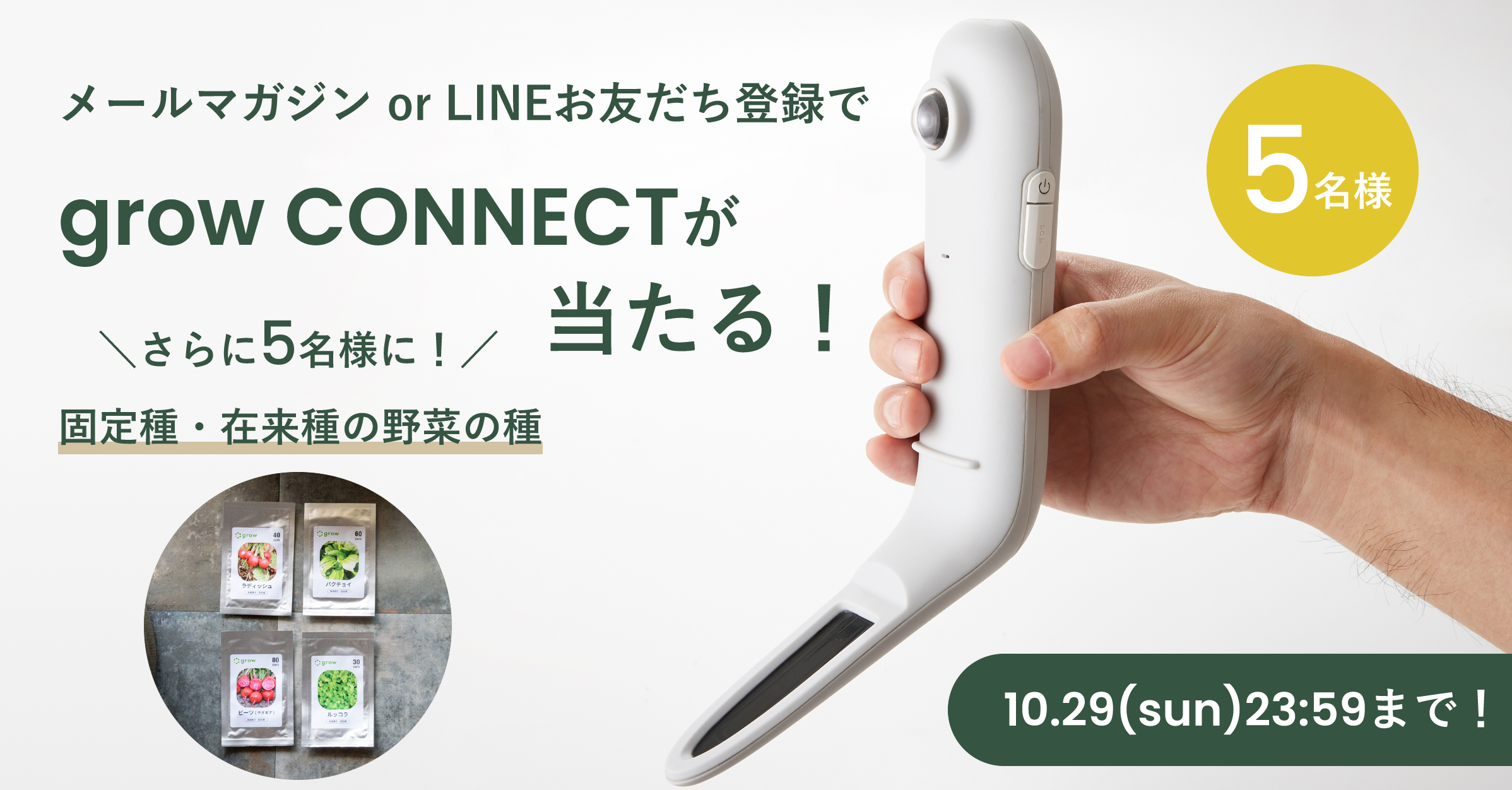 grow JOURNAL のリニューアルを記念して、grow LINE公式を友だち追加、又はメールマガジンをご登録いただいた方から抽選で5名の方にタイムリーな野菜栽培のアドバイスを可能にするIoTプロダクト「grow CONNECT」を、抽選で5名にシェアリングIoT農園「grow FIELD」で採れた固定種・在来種の野菜の種をプレゼントする登録者限定プレゼントキャンペーンを10月29日(日)まで実施します。