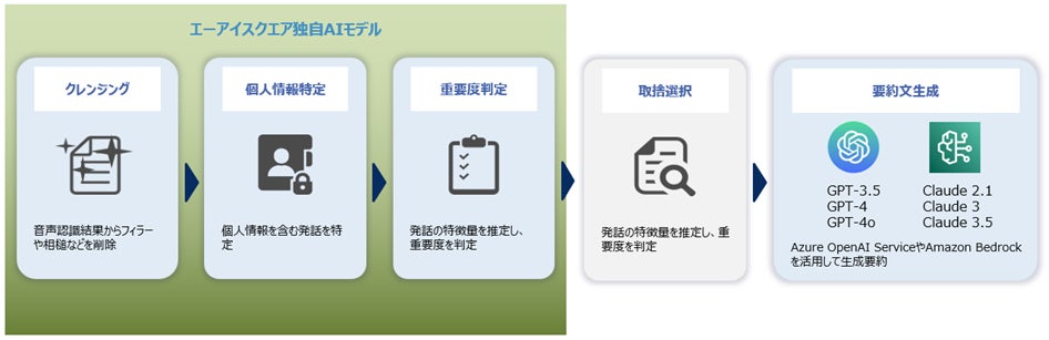 音声認識テキストに対して、重要度の判定やクレンジング、個人情報の特定を自動で行い、生成AIを利用する前に文章を自動で正規化します。また、個人情報をあらかじめ除外することで、生成AIに個人情報が渡ることを防ぎ、安全に利用できるようにします。