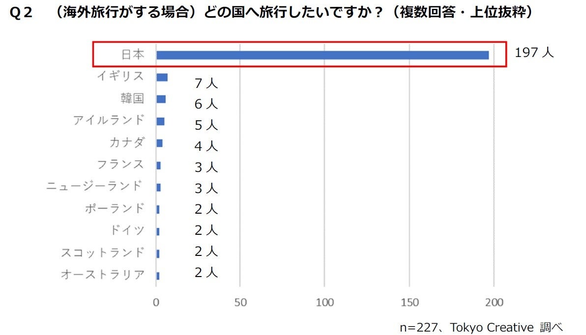 ⽇本⼈と外国⼈の“両⽬線”を⽣かした動画で⾃治体や企業の外国⼈へのアプローチを⽀援するTokyo Creative 株式会社(所在地︓東京都墨⽥区、代表取締役︓中川智博・⼩野沢隆、https://www.tokyocreative.jp/ja/、以下Tokyo Creative)は、⽇本以外の国に住む⽇本以外の国籍をもつ外国⼈を対象に「⽇本旅⾏に関する意識調査」を実施しました。