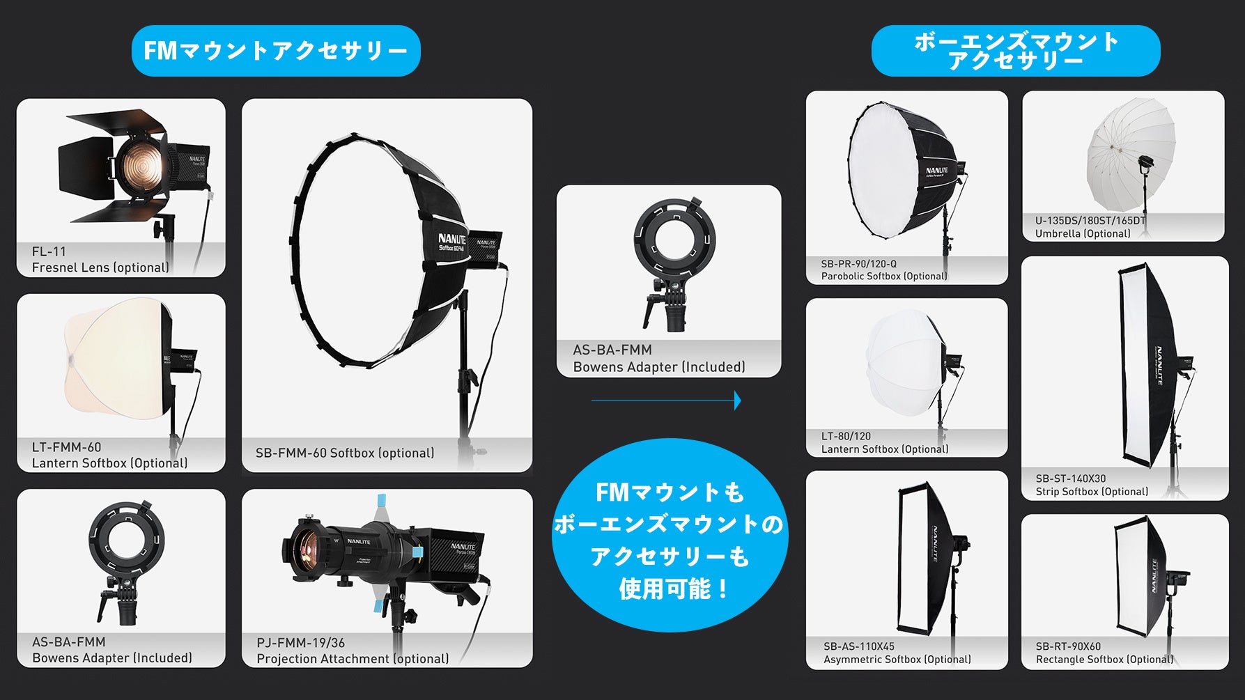 Forza 150BはFMマウントになっているため、Forza 60シリーズに対応したアクセサリーを使用することができます。さらに、ボーエンズマウントアダプターが付属しているためNANLITE製のアクセサリーのほとんどを使用して撮影できます。ソフトボックスを使用して柔らかい光を表現することもプロジェクションアタッチメントを使用して光の形を作ることも可能です。アクセサリーを使用して表現の幅を広げることができます。