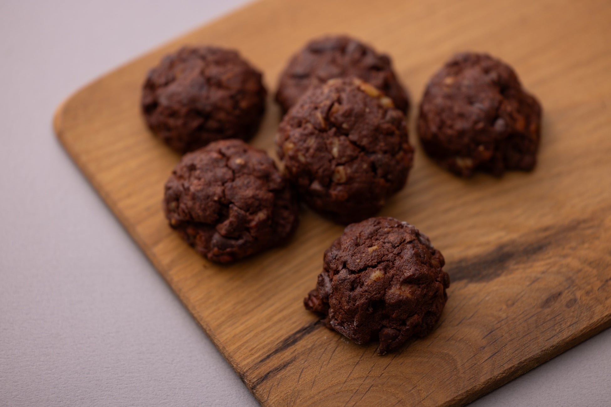 ココアを使わず、ダークチョコレートだけで作ったチョコレートチップクッキー。ダークチョコレートのほろ苦さにチョコレートチップのほどよい甘さを運びます。ピーカンナッツとクルミがアクセントの大人の味わいのクッキーです。