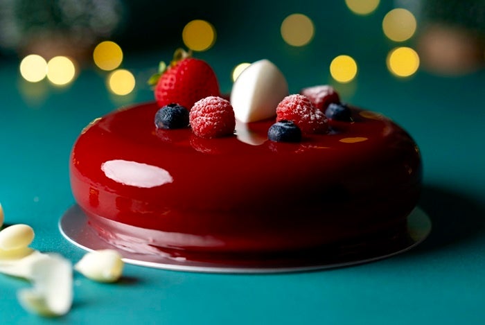 気品に満ちたつややかな光沢が美しい、赤い果実の輝くグラサージュのクリスマスケーキ。あまおう苺のゼリーとダークチョコレートのクリームを、ライスクリスピーを忍ばせた食感の良いピスタチオスポンジ生地で挟み、マスカルポーネチーズのムースにとじ込めました。まろやかなピスタチオとベリーの甘酸っぱさが相性抜群。グラサージュにダークチョコレートを合わせ、“深みある大人の赤”に仕上げました。