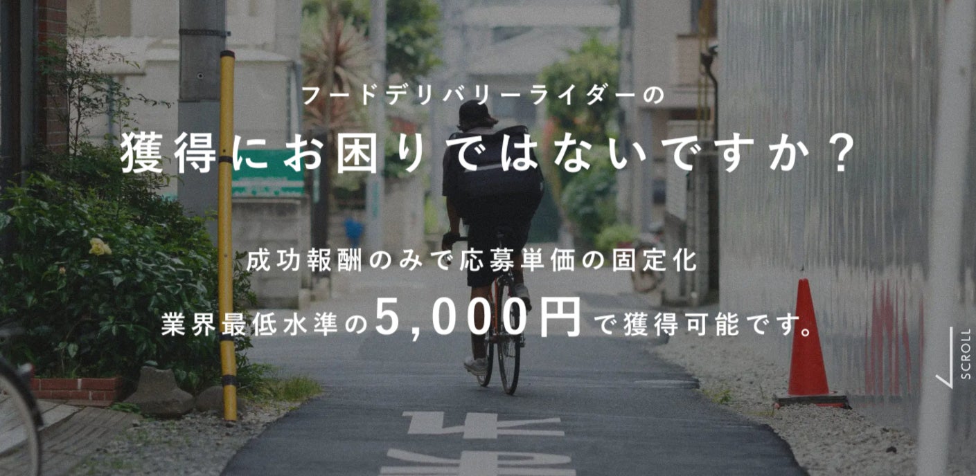 求人掲載料金「無料」掲載期間「無制限」、一応募あたり5,000円の成功報酬型のフードデリバリーライダー採用を支援