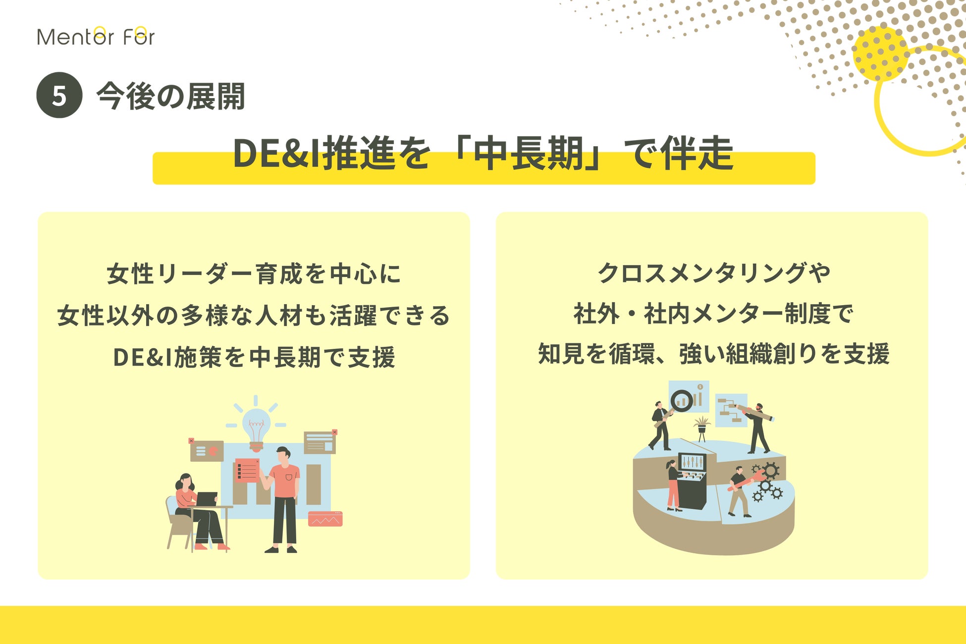 Mentor Forでは、社会・組織のDE&Iを推進し、人と組織の成長に伴走することをミッションとしており、ロールモデル人材を「社外メンター」として自社育成、女性を始めとした多様な管理職・候補にマッチングするサービスを提供しています。また、社内リソース・知見の活用を踏まえた社内メンター育成・制度運用、DE&Iコンサルテーションなどをワンストップで支援しています。