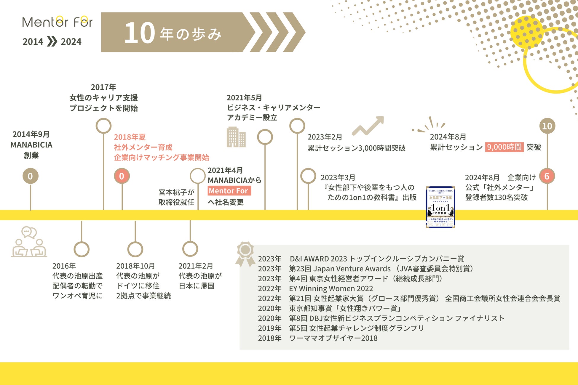 企業のDE&I(Diversity, Equity & Inclusion)・女性活躍推進を目的とした、社外メンターの育成・マッチング・社内メンター制度支援を提供する株式会社Mentor For(東京都渋谷区、代表取締役・池原真佐子、以下Mentor For)は、2024年9月1日をもちまして会社設立から10年、メンター事業開始から6周年を迎えます。皆様の日頃のご愛顧に心より感謝申し上げます。