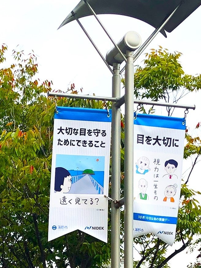 株式会社ニデック(本社: 愛知県蒲郡市、代表取締役社長: 小澤素生) は、蒲郡市と連携し、目の愛護デーとされる10月10日を含む10月の1カ月間限定で、蒲郡駅南口に蒲郡市出身の漫画家である大橋裕之氏のイラストを添えたフラッグを掲示します。「視力は一生もの」「遠く見てる?」と呼びかけるフラッグを市民の皆さまに見ていただくことで、目の健康を意識するきっかけとなることを狙います。
