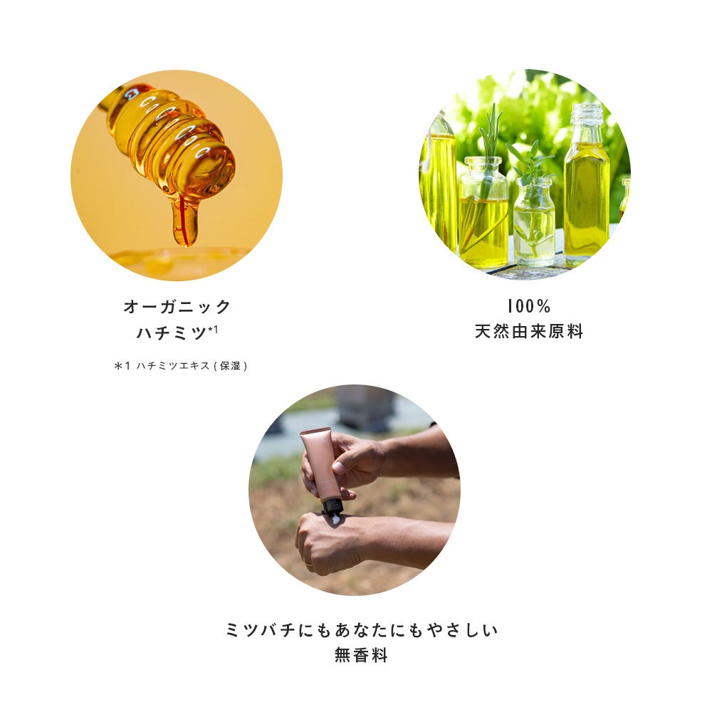 外仕事で手を酷使するビーキーパー(養蜂家)のその手をしっかりとした潤いベールで包み込み、使用後は作業がしやすいように肌表面はべたつきのない肌感触です。