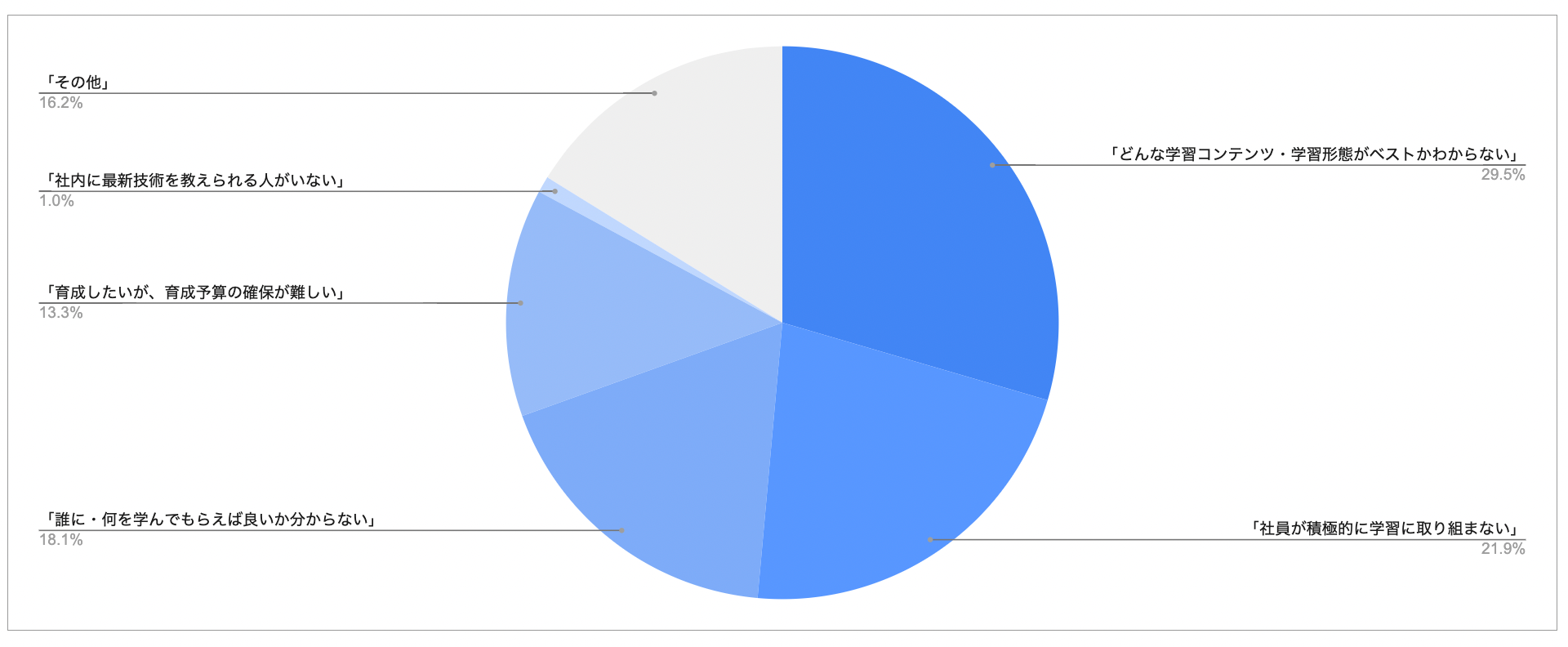 「どんな学習コンテンツ・学習形態がベストかわからない」の回答が最も多く、次に「社員が積極的に学習に取り組まない」が多く、リスキリングの環境を整えているが、学習の促進を行えていない様子が分かりました。一方で、「社内に最新技術を教えられる人がいない」が1%と社内に最新技術を教えるほどのスキルを有するメンバーが所属していることも分かりました。