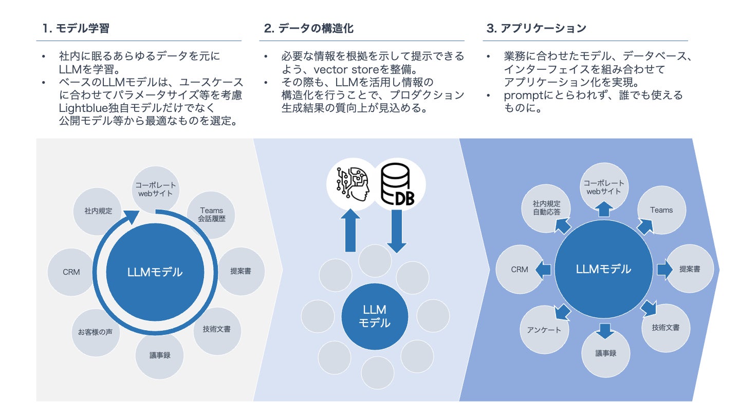 LLM導入にあたり、以上3つの独自開発メリットを十分に発揮できるよう、Lightblueは以下のようなソリューションを提供します。