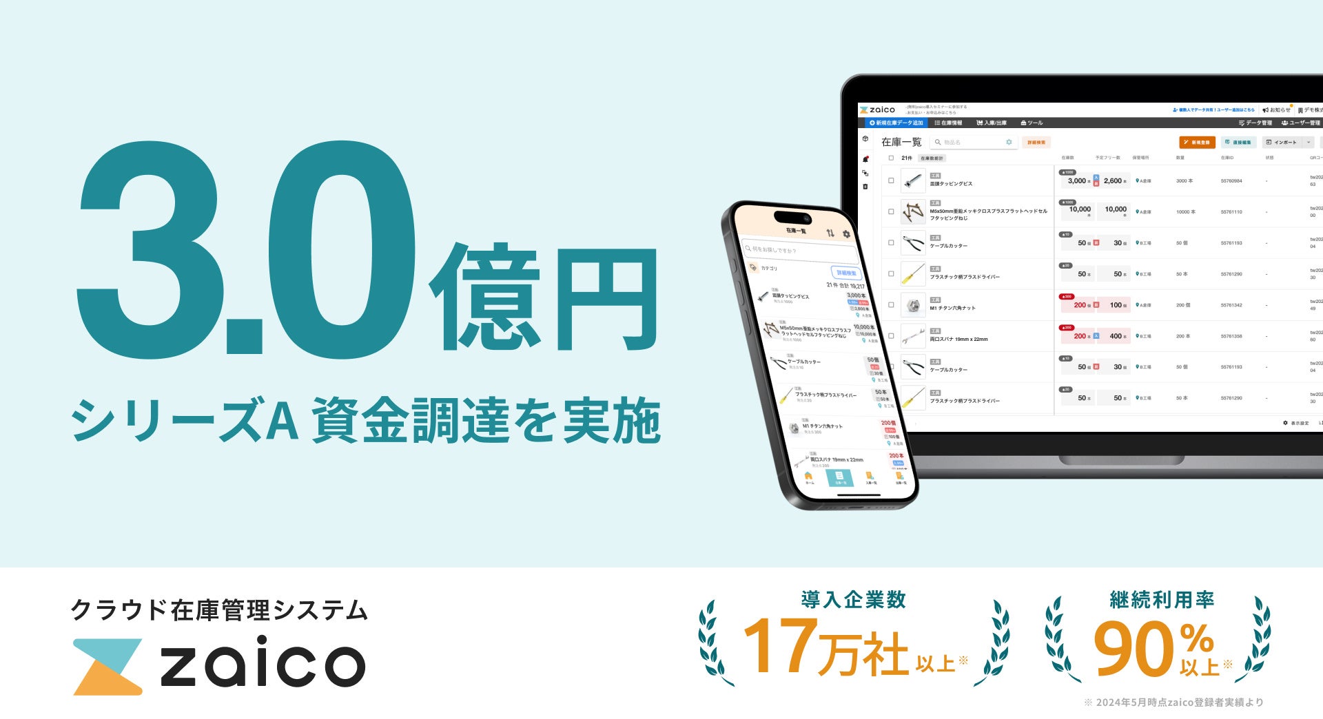 在庫管理アプリNo.1(※)のクラウド在庫管理システム「zaico」を提供する株式会社ZAICO(本社:山形県米沢市、代表取締役:田村壽英)は、アーキタイプベンチャーズ株式会社を引受先とした第三者割当増資により、シリーズAラウンドで3億円の資金調達を実施いたしました。