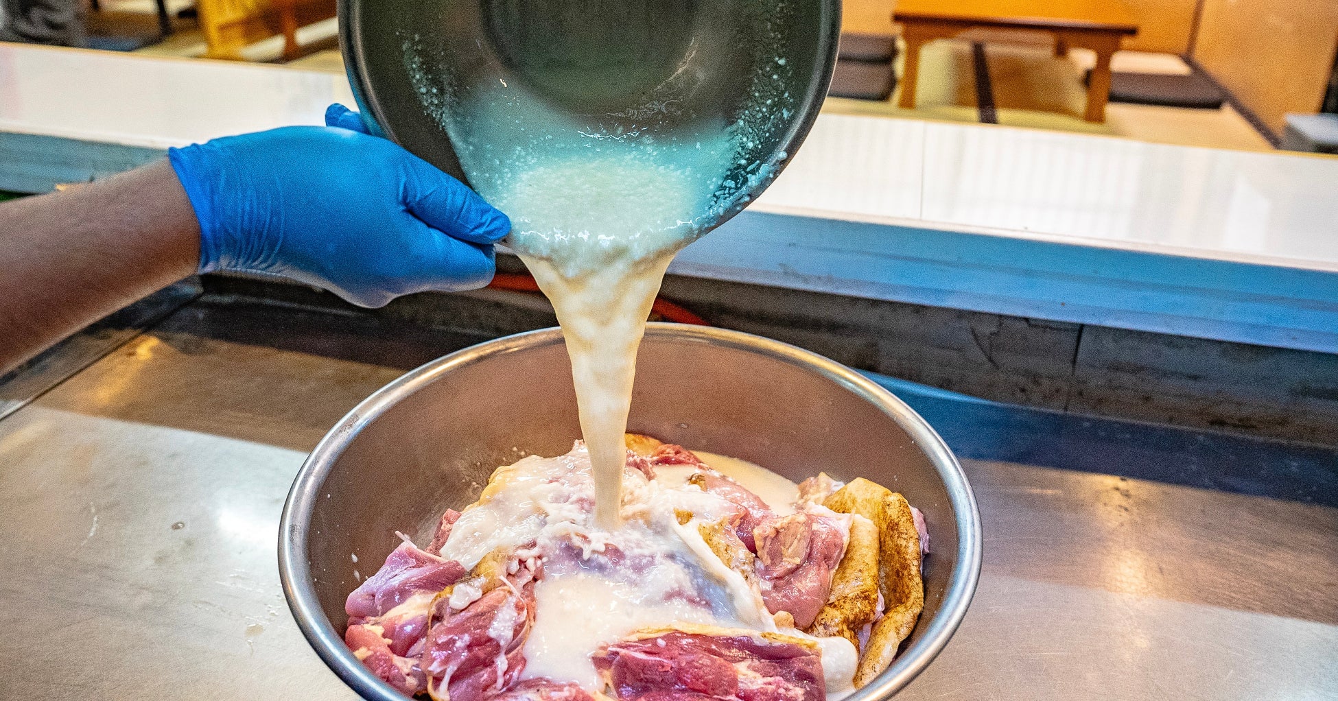 政利さん: 一晩塩麹に漬け込んだ鶏肉を、備長炭で香ばしく炙り、余計な火が入らないよう氷水で締める。これがうちの「鳥刺し」です。塩麹の力で肉は柔らかく、口に入れた瞬間にとろける食感が楽しめます。「これが食べたくて来た」と言ってくださるお客様も多いですね。