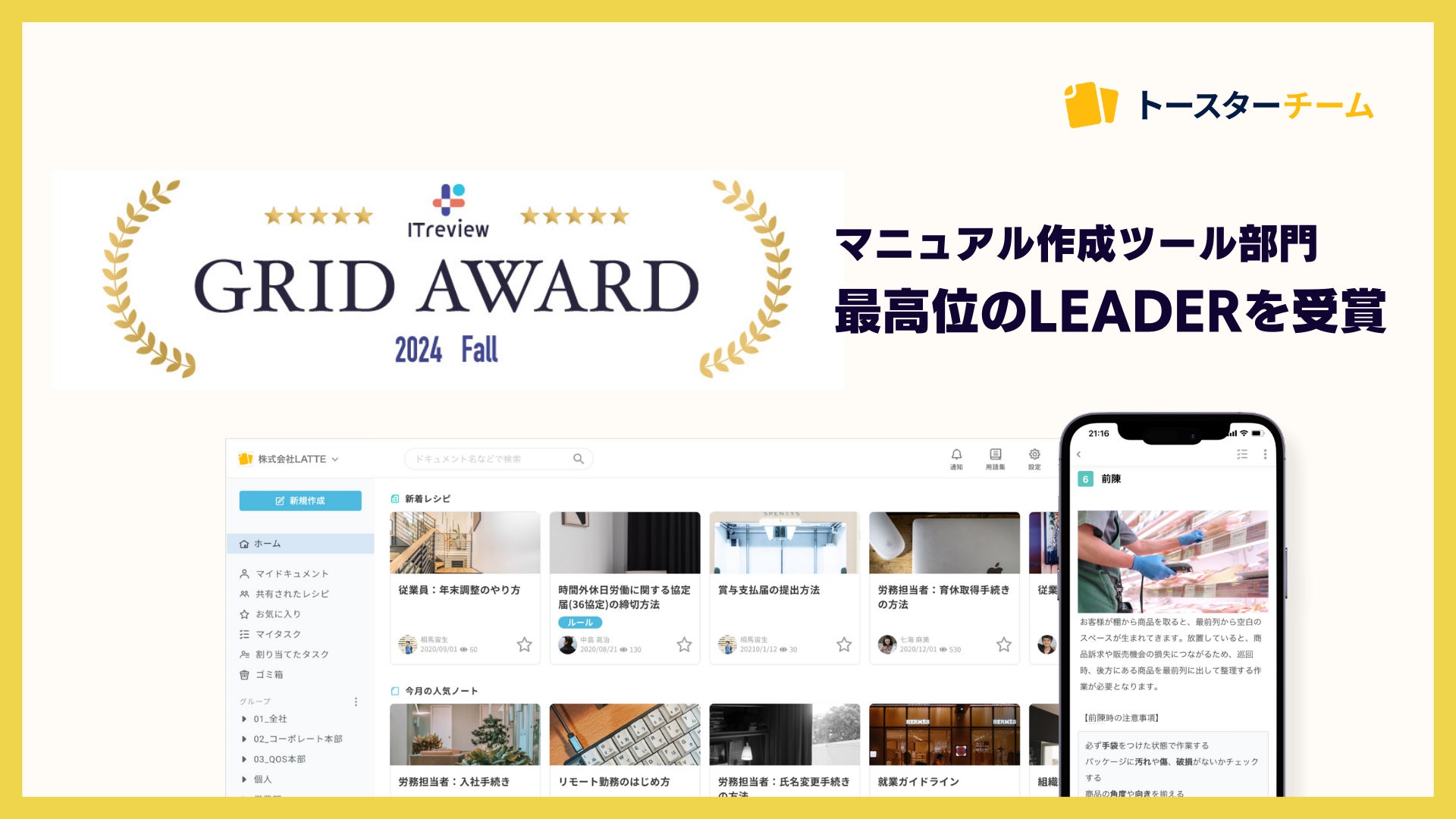 AIマニュアル作成ツール「トースターチーム」が「ITreview Grid Award 2024 Fall」マニュアル作成ツール部門で最高位のLEADERを受賞