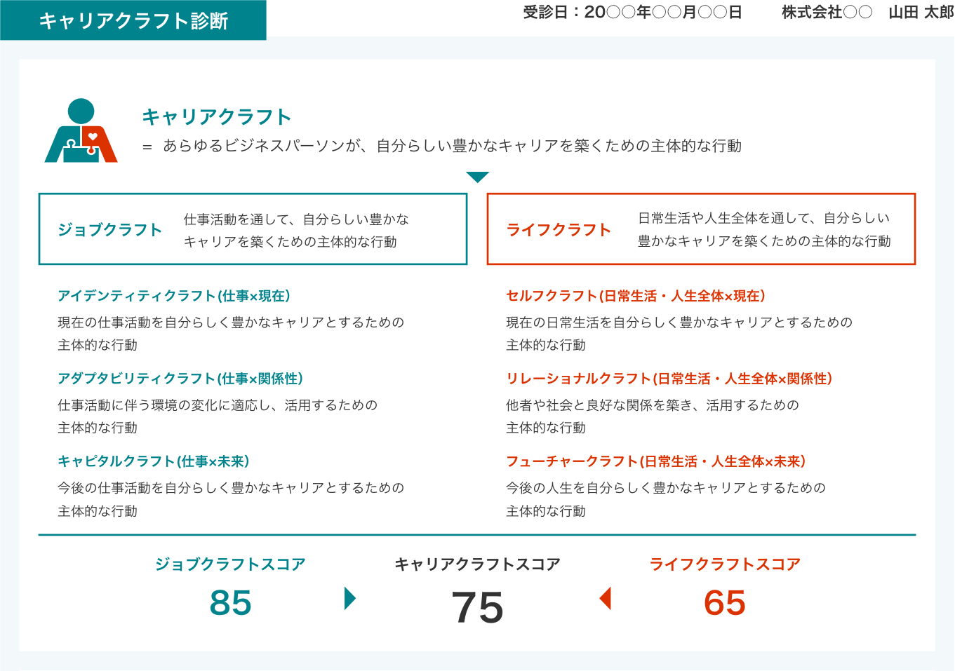 「働くすべての人が、自分らしい豊かなキャリアを築くための主体的な行動」をキャリアクラフトと定義し、6カテゴリ・60項目の診断を開発しました。