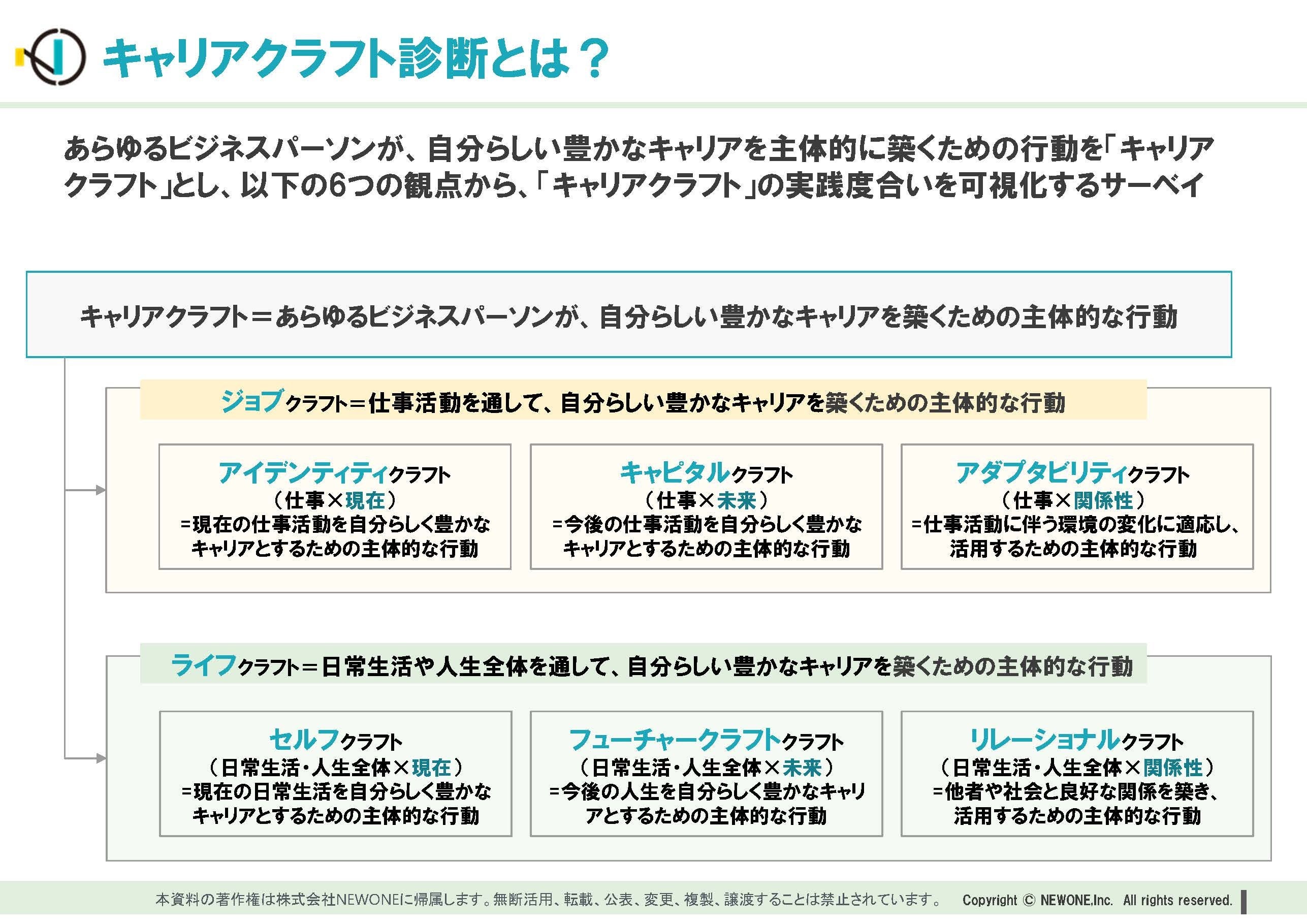 人材育成・組織開発サービスを提供する株式会社NEWONE(本社:東京都千代田区 代表取締役:上林周平、以下NEWONE https://new-one.co.jp/)は、最先端のキャリア開発研究を牽引する法政大学教授/田中研之輔氏の監修と共同開発により、6カテゴリ・60項目の「キャリアクラフト診断」をローンチしました。「キャリアクラフト診断」は人的資本の最大化を支援し、自分らしいキャリアの積み方の可視化を実現しました。2022年6月より販売開始いたします。