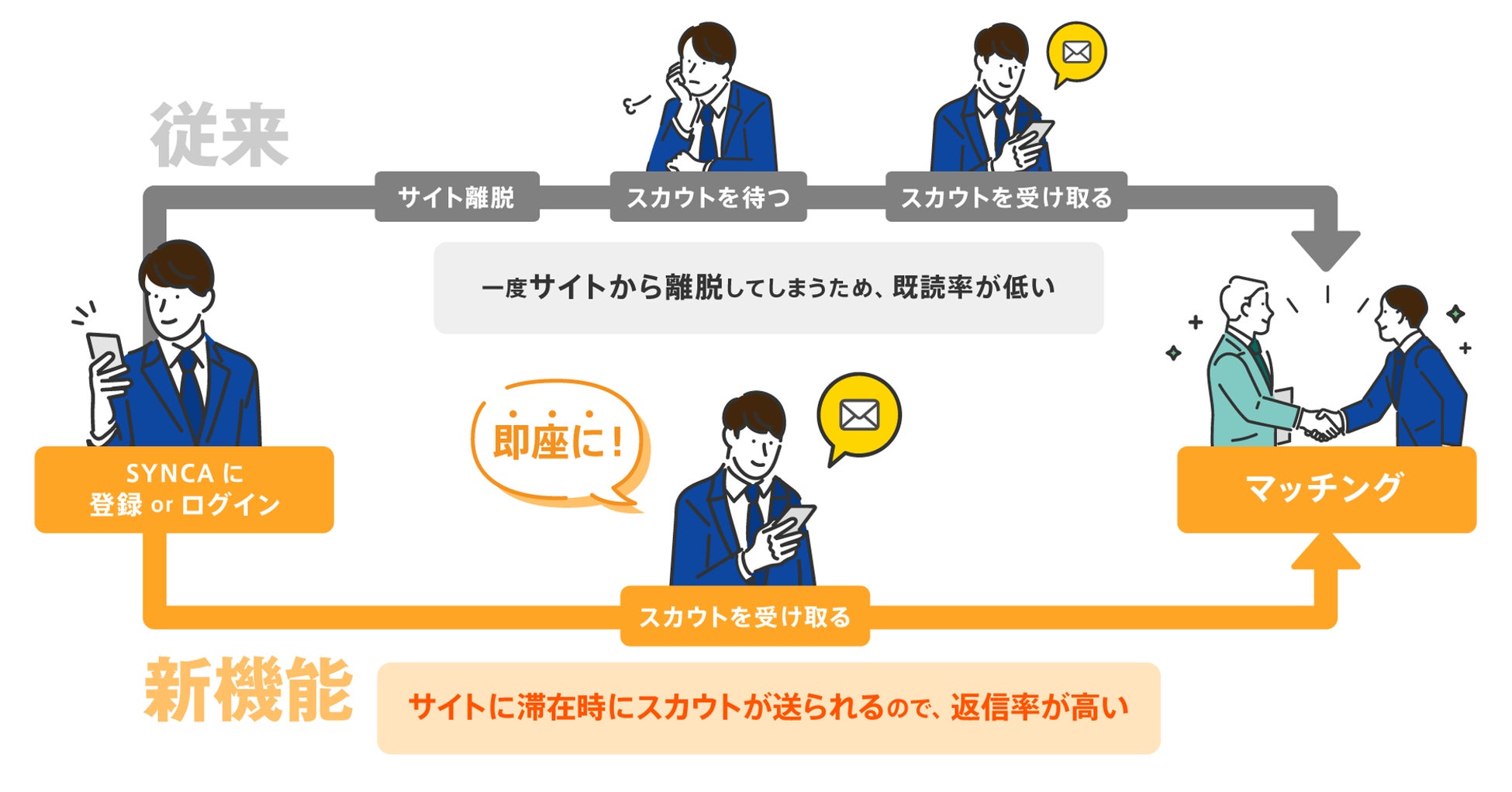 この度、ダイレクトリクルーティングサービスを運営する「SYNCA」に即時スカウト送信機能を追加いたしました。これにより、候補者へのスカウトメール既読率が10%以上アップしています。実際の応募者を待つだけでなく、興味・関心を持つターゲットに最適なタイミングでスカウトを送ることで人材の母集団形成を目指します。