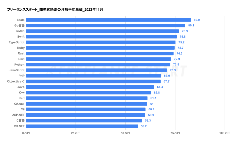 具体的な月額平均単価は1位「Scala」が82.9万円(前月比+3千円・0.36%増)、2位「Go言語」が80.1万円(同+4千円・0.50%増)、3位「Kotlin」が76.9万円(同+1千円・0.13%増)でした。