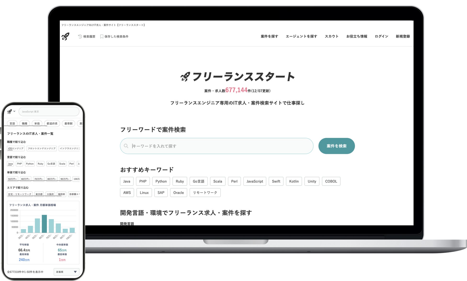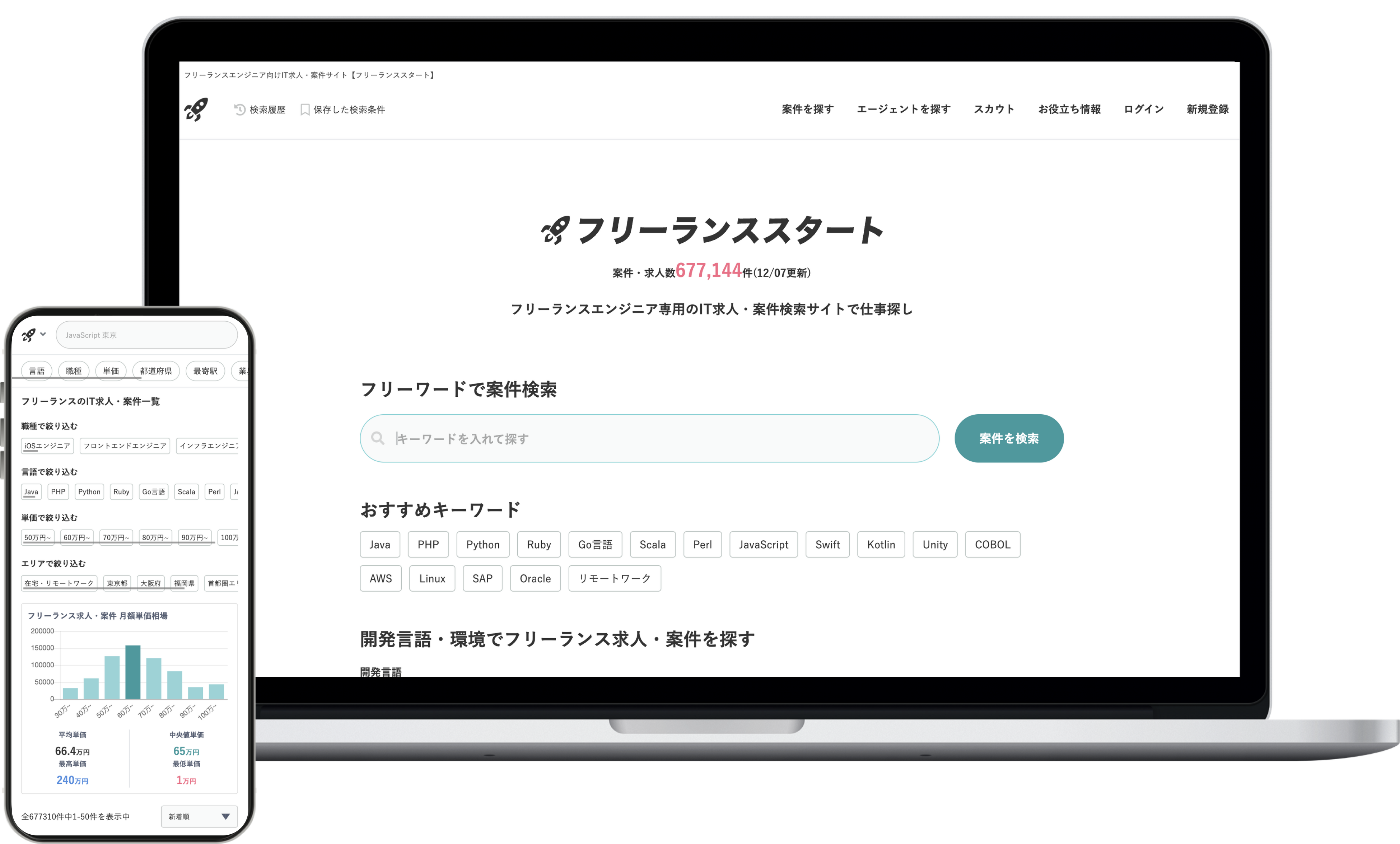 2023年11月のフリーランス案件の月額平均単価は66.4万円、さらに2023年12月7日時点での掲載案件数は677,144件です。