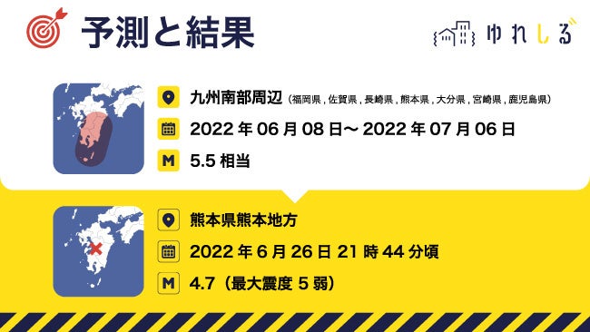 株式会社Link-U(本社 : 東京都千代田区、 代表取締役 : 松原 裕樹)が運営する地震防災サービス「ゆれしる」上で2022年6月8日に発表した「九州南部周辺」を対象とした地震予測が的中し、同26日に熊本県熊本地方を震源とする最大震度5弱、マグニチュード4.7の地震が発生しました。