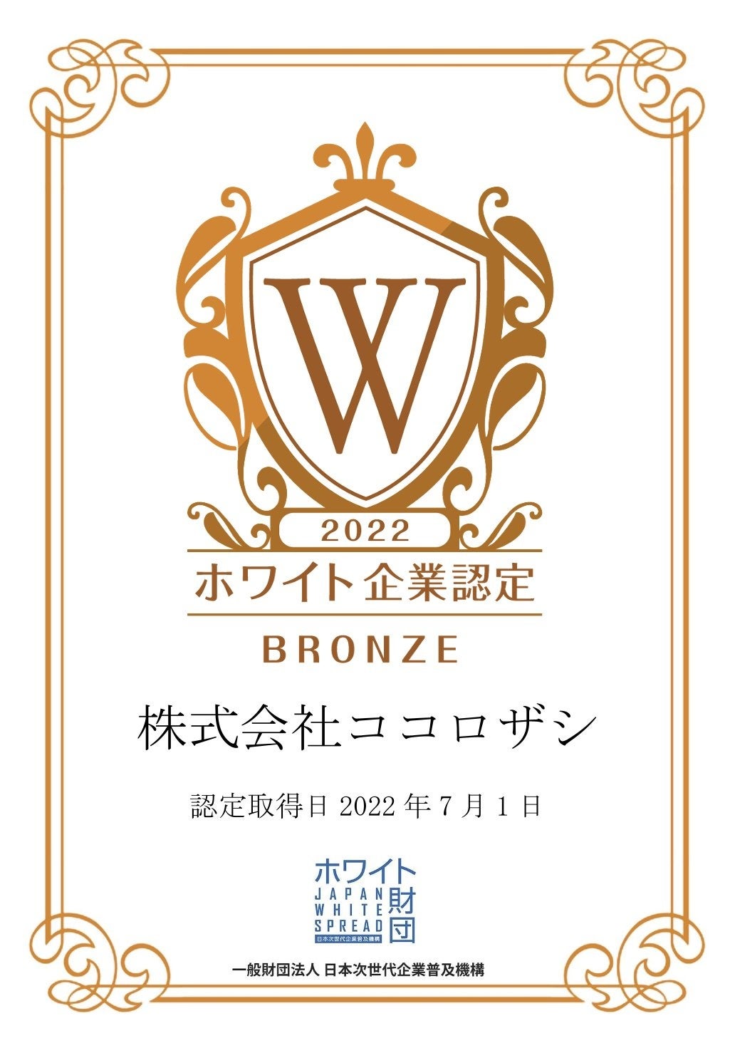 2022年7月1日、株式会社ココロザシが、一般財団法人日本次世代企業普及機構(通称:ホワイト財団)が運営する「ホワイト企業認定 ブロンズ」を取得しましたことをお知らせいたします。
