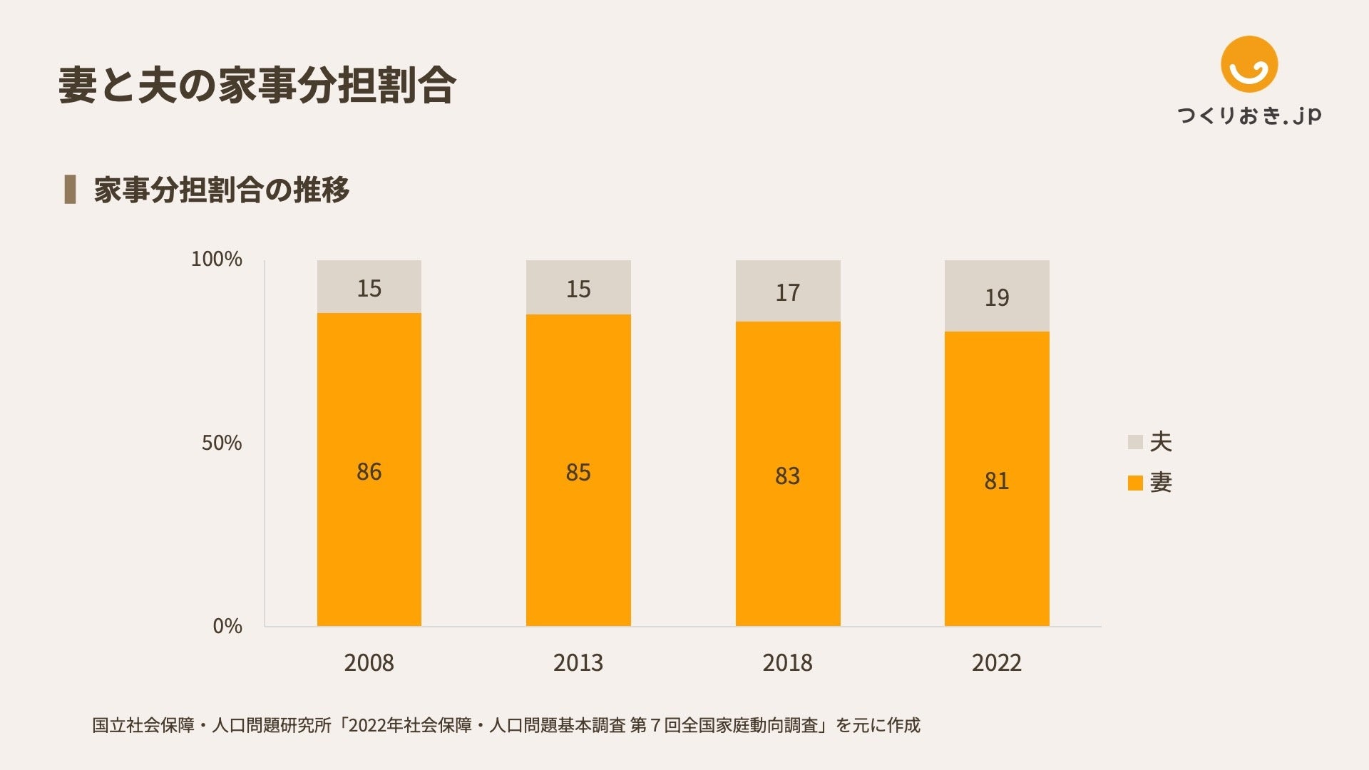 共働き世帯が増加している一方、家事負担は依然として女性に偏っています。妻と夫の家事分担の割合を見ると、妻が81%で、夫が19%となっています。2010年には「イクメン」が新語・流行語となりましたが、この10年で夫婦の家事分担に大きな変化は見られません(図2)。