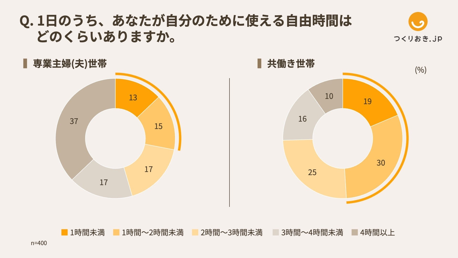 ・自分のために使える自由時間について、1日2時間未満は専業主婦(夫)世帯で28%、共働き世帯では49%。共働き世帯の方が自由時間がない。