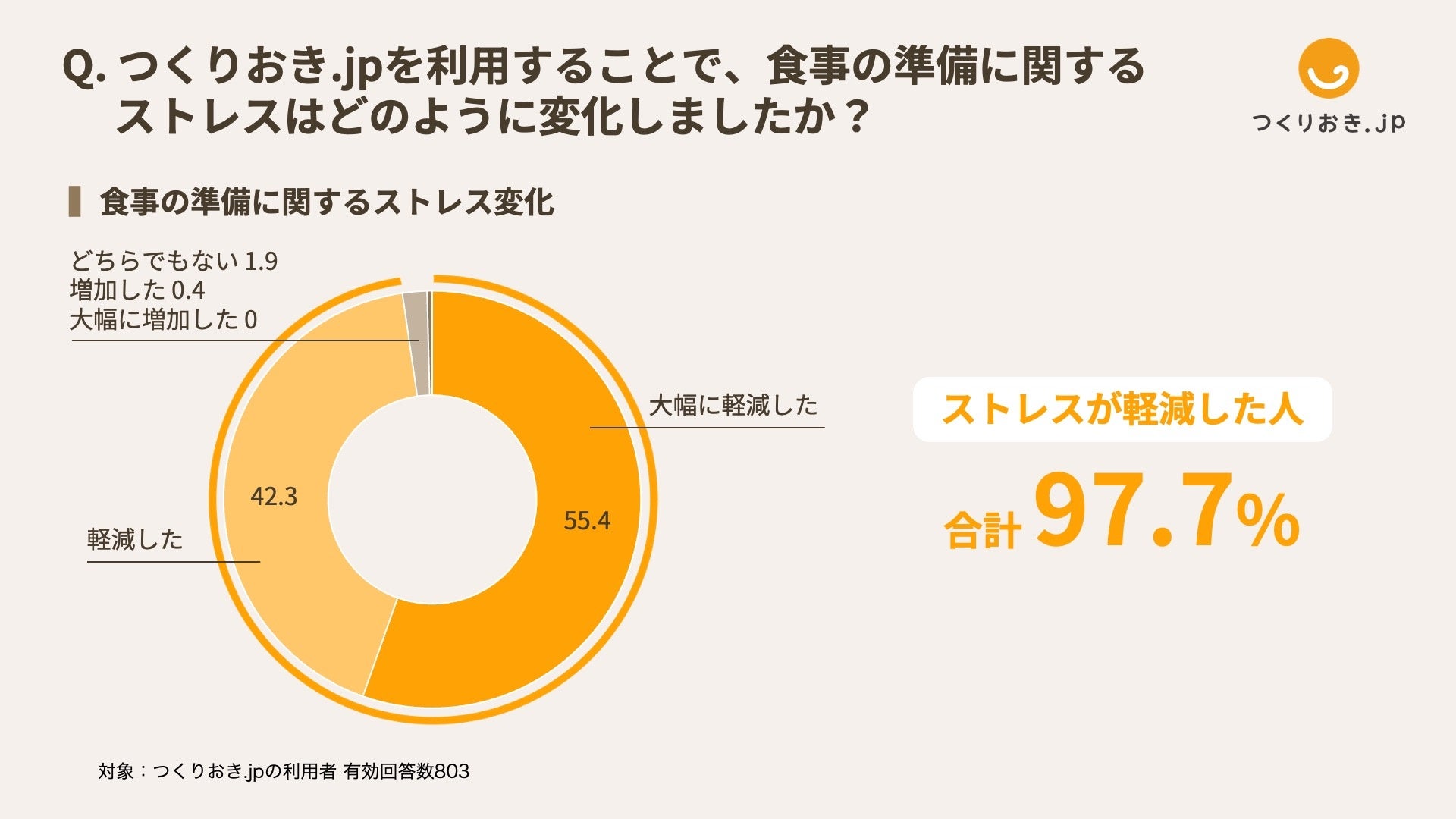お客様アンケートでは、つくりおき.jpを利用することで食事の準備のストレスが軽減したと回答した人が97.7%(「大幅に軽減した」55.4%、「軽減した」42.3%の合計)という結果も出ています(図8)。