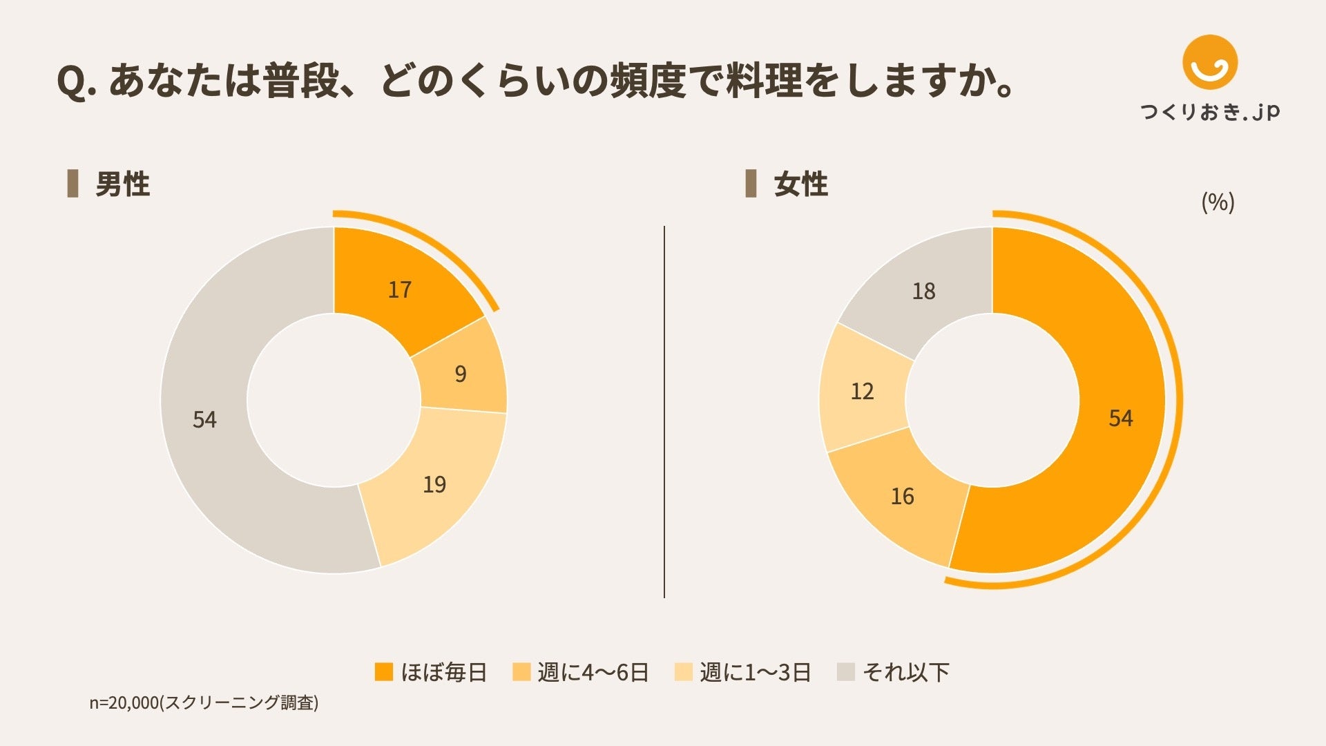 ・料理の頻度について、「ほぼ毎日」と回答した男性が17%に対し、女性は54%と、料理も女性に偏っている。