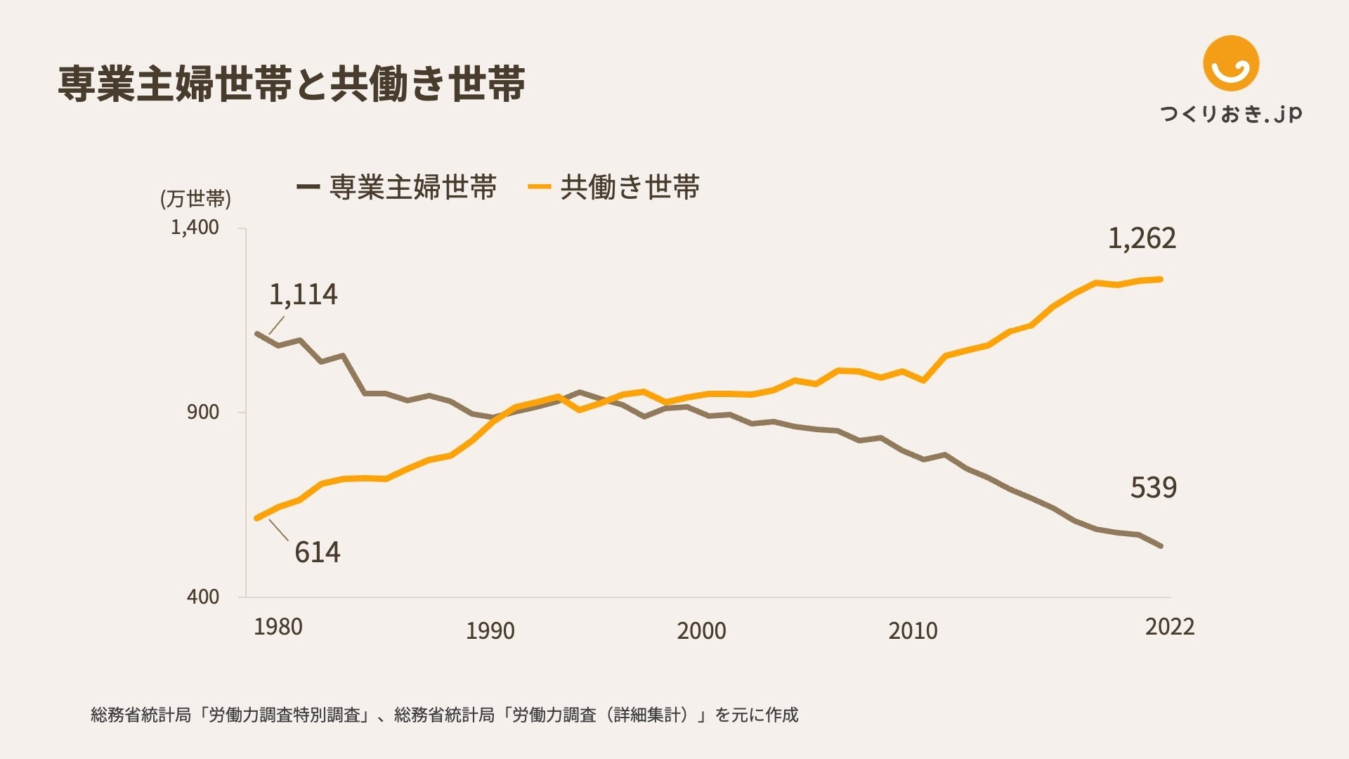 女性の社会進出が進んだことにともない、共働き世帯も増加傾向が続いています。共働き世帯は1980年614万世帯から2022年1,262万世帯となり、一方で専業主婦世帯は1980年1,114万世帯から2022年539万世帯まで減少しています。この40年間で共働き世帯と専業主婦世帯の数は逆転し、今では夫婦世帯の7割を共働き世帯が占めています(図1)。