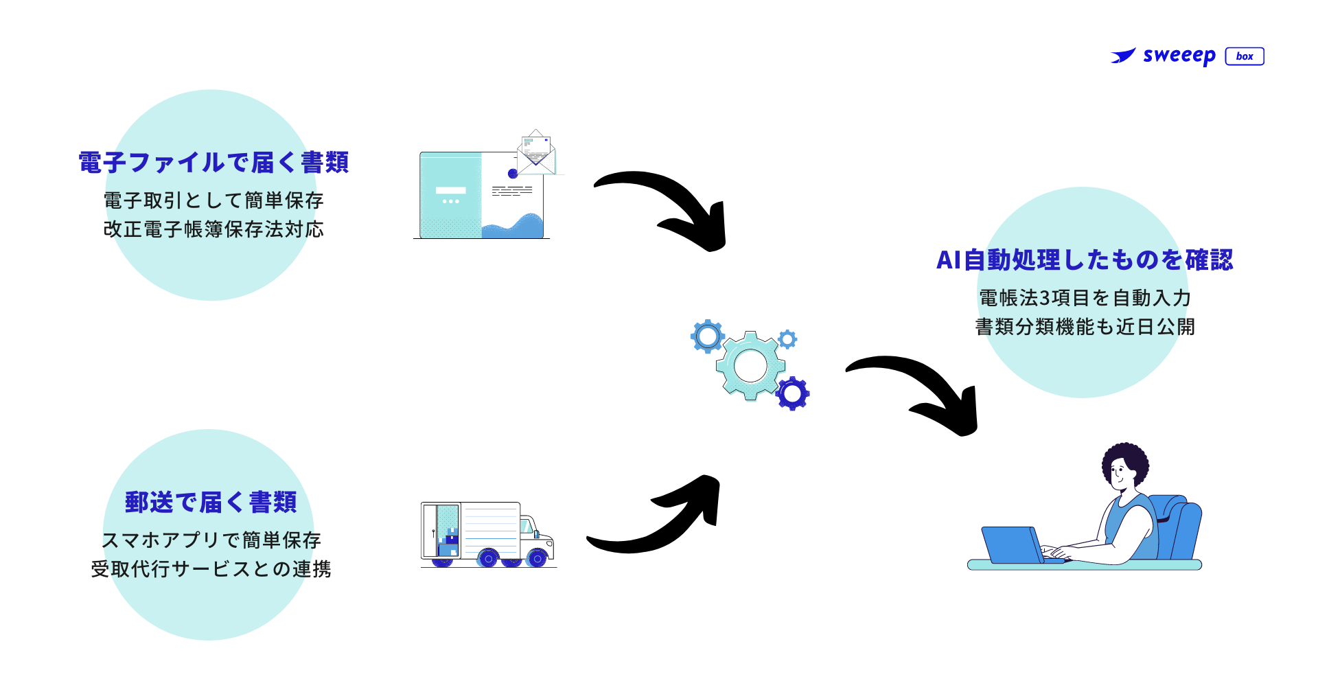 「sweeep Box」はビジネス文書のオンライン受取と電子保管に特化した新サービス。sweeep Boxを使えば、わざわざ出社しなくても、いつでもどこでも簡単に書類を受け取れ、かつ電子帳簿保存法に則って適切に保管することが可能になります。