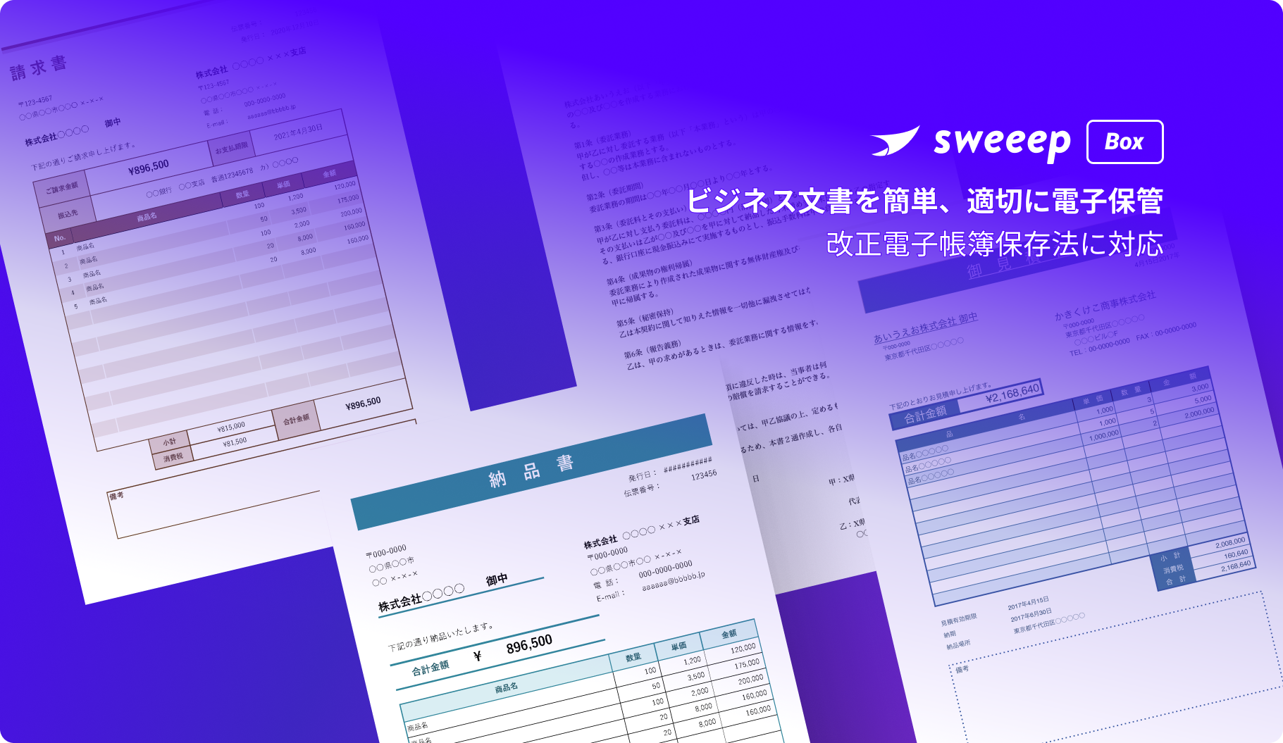 請求書自動化AIを運営するsweeep株式会社(本社:東京都渋谷区、代表取締役:村山毅、以下当社)は、ビジネス文書のオンライン受取や改正電子帳簿保存法に対応した保管機能をもつ、新サービス「sweeep Box」を本日より正式に提供開始いたします。