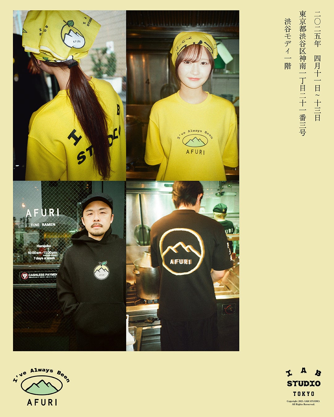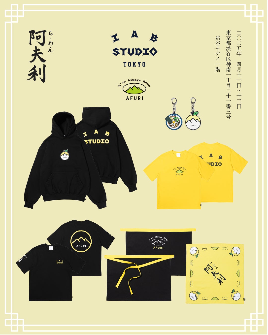IAB STUDIOのクルーが来日するたびにAFURIを好んで訪れてくださっており、今回のコラボレーションが実現しました。 コラボレーションアイテムは、渋谷で行われる「IAB STUDIO」のポップアップストアで販売されるほか、一部アイテムは「AFURI 渋谷道玄坂」とAFURI公式通販サイトでも販売します。また、コラボデザインのTシャツは、「AFURI 渋谷道玄坂」オープン時にスタッフユニフォームとしても着用します。