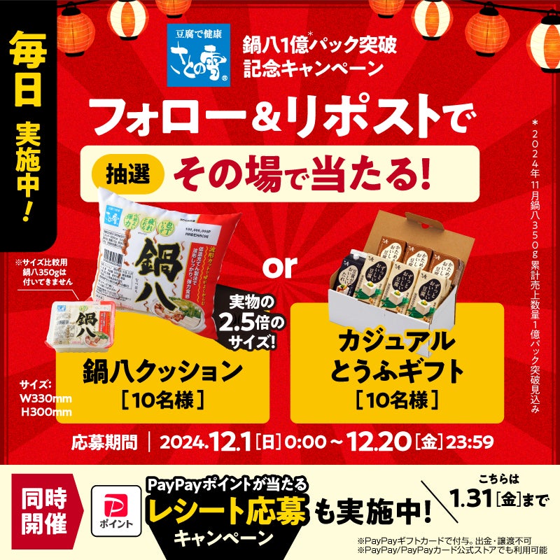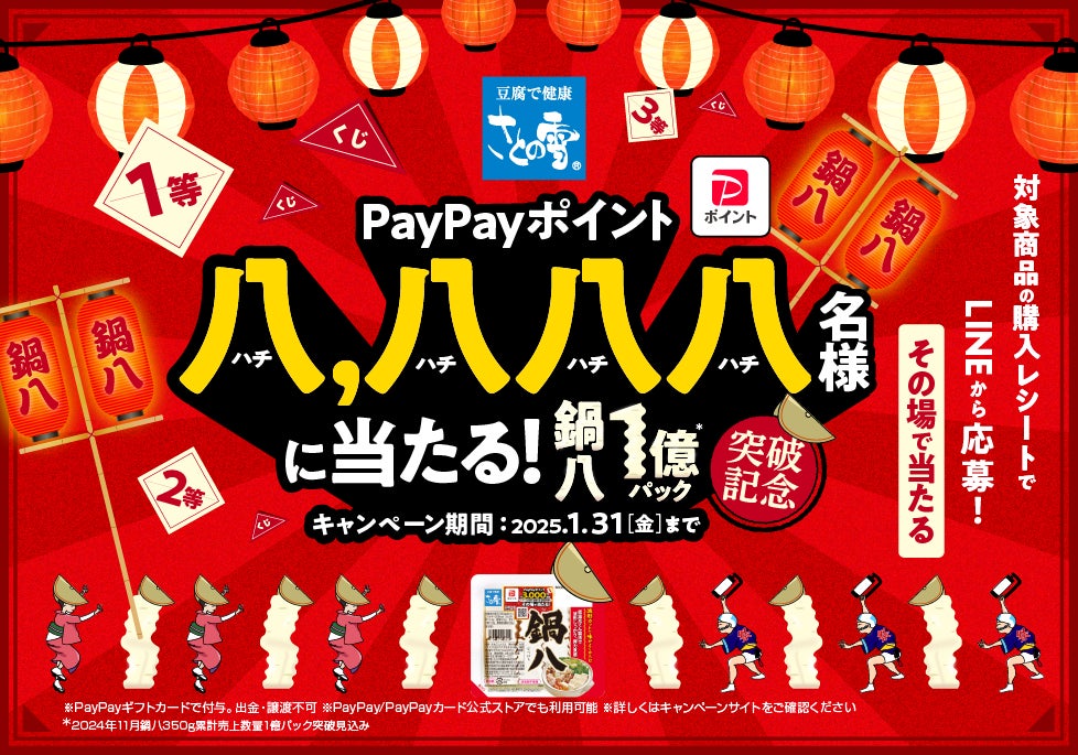 四国化工機株式会社のグループ会社である、さとの雪食品株式会社(徳島県鳴門市大津町、代表取締役社⻑:植田滋)は、対象商品を購入したレシートでポイントをためて応募すると、PayPayポイントが8,888名様へ抽選で当たる、さとの雪「鍋八1億パック突破記念キャンペーン」を2024年12月1日より開催いたします。
