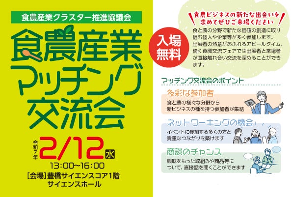 食農産業クラスター推進協議会恒例の『食農産業マッチング交流会』を開催いたします。食農ビジネスの新たな出会いを求めてぜひご来場ください。
