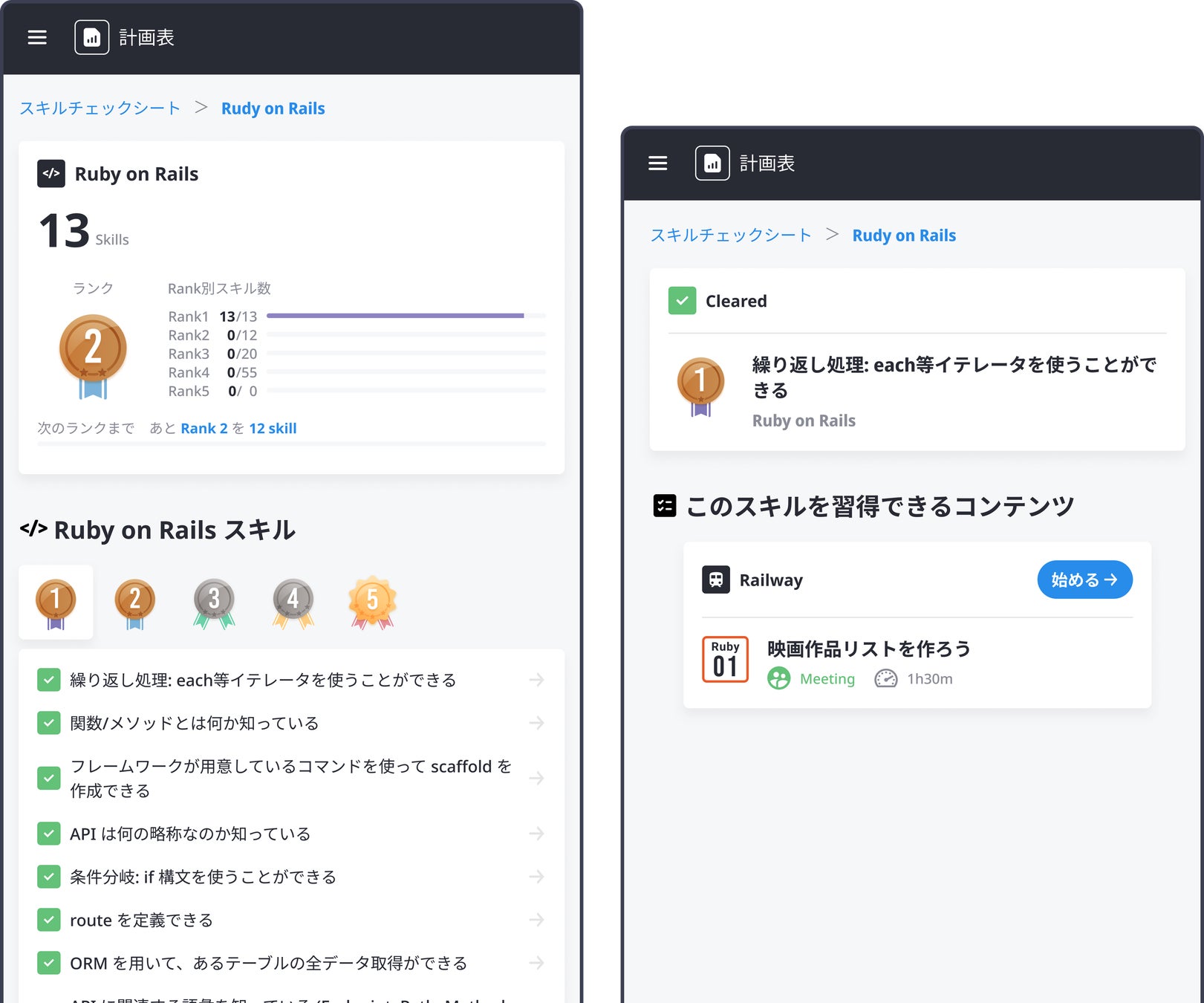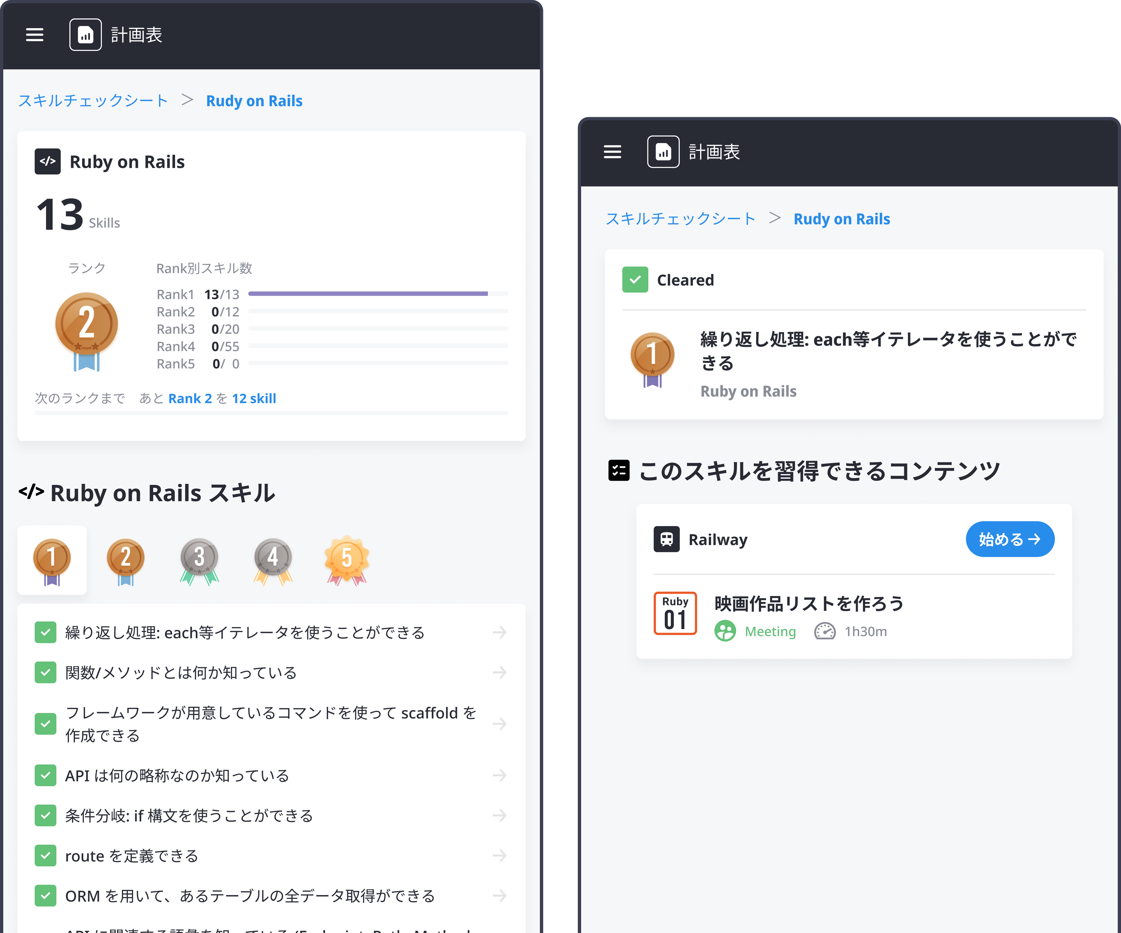 ユーザーのスキルレベルを5段階で可視化し、それぞれのスキルレベルにあったネクストアクションをご案内します。スキルアップし、一定条件を満たすと、RankUpし、TechTrain内で使える機能が拡張します。