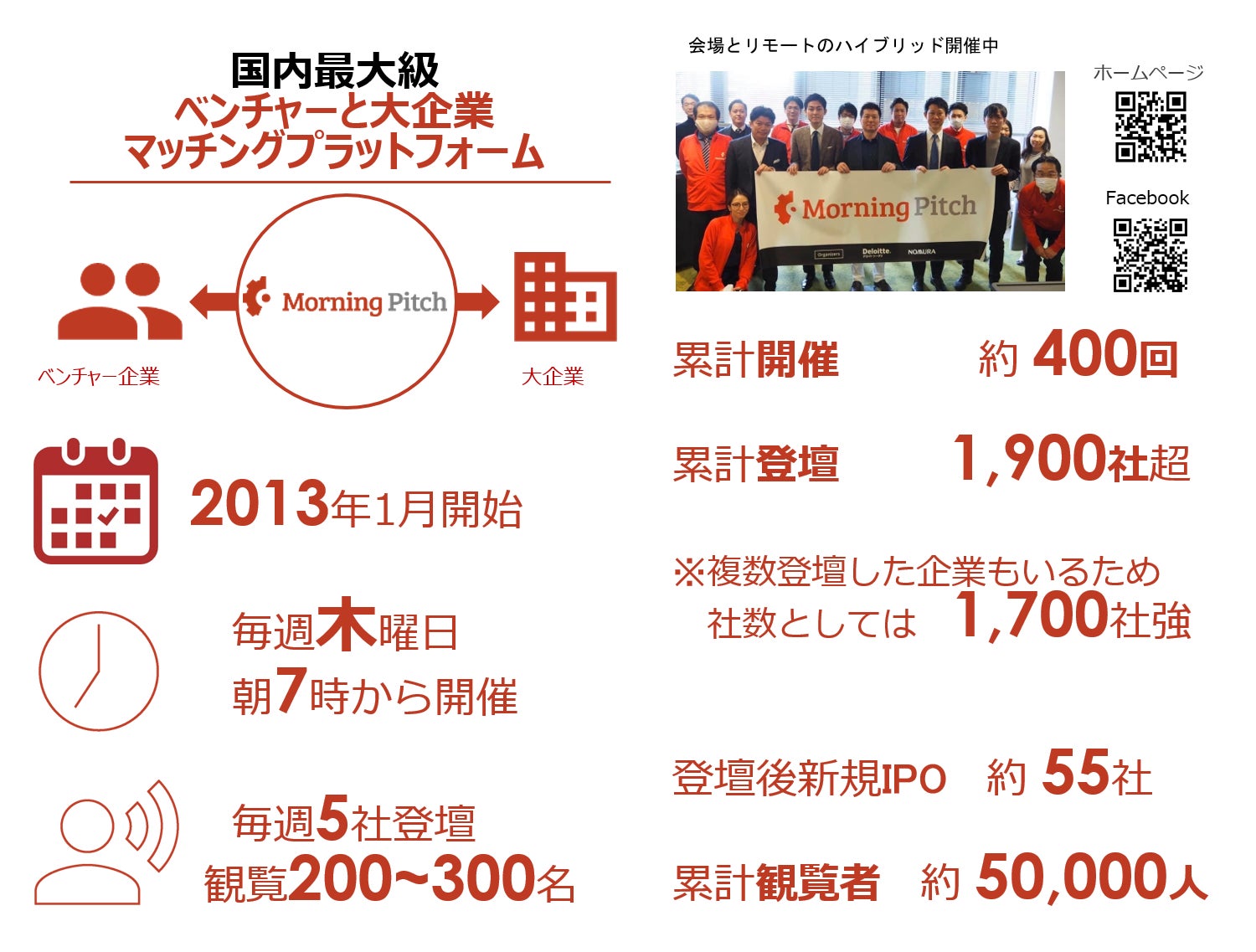 Morning Pitchは、毎週木曜AM7時から開催している、ベンチャー企業と大企業の事業提携を生み出すことを目的としたピッチイベントです。毎週5社のベンチャー企業が、大企業・ベンチャーキャピタル・メディア等のオーディエンス約200~300名に対しピッチを行います。2013年1月から開始し、2021年12月時点で全400回超、累計1,900社超のベンチャー企業が登壇しています。デロイト トーマツ ベンチャーサポート株式会社、野村證券株式会社の2社が幹事となり開催しています。https://morningpitch.com/