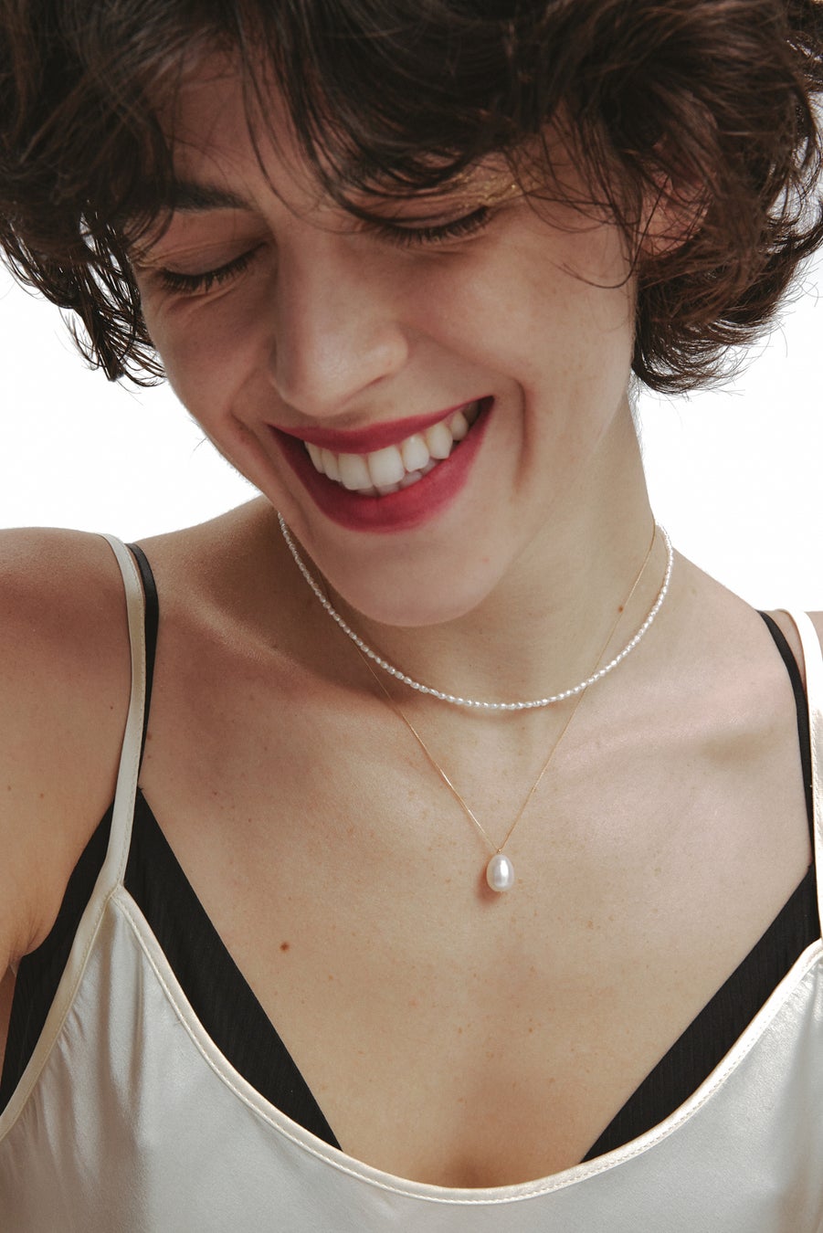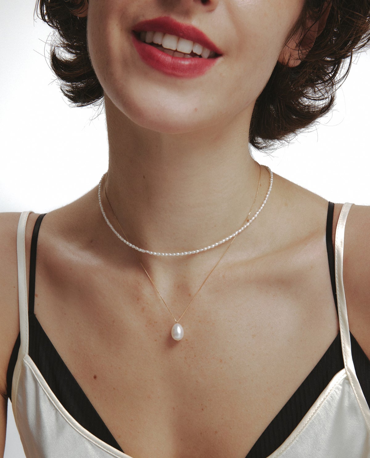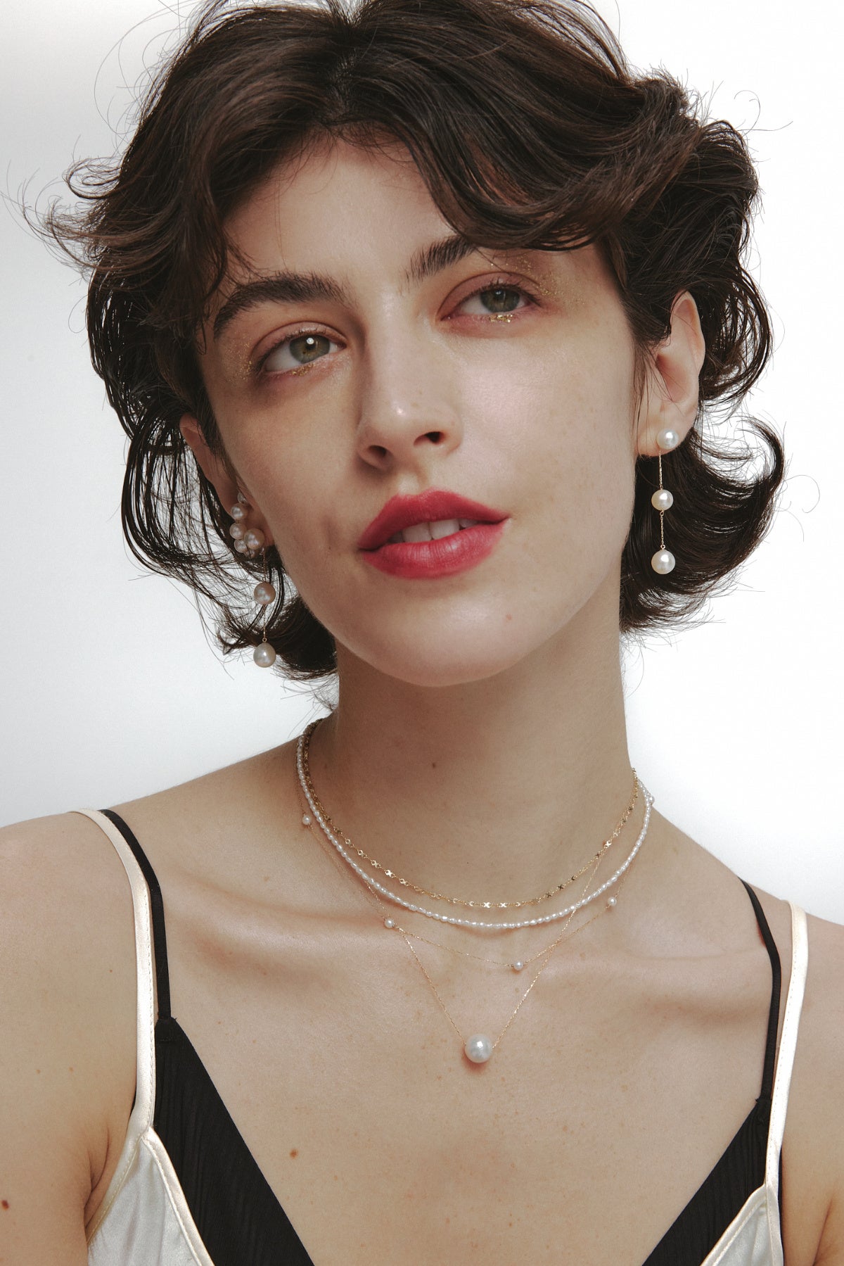 有機的な一粒のパールのシェイプと、肌に溶け込む粒子のようなパールの連なりがデコルテに知性を宿します。