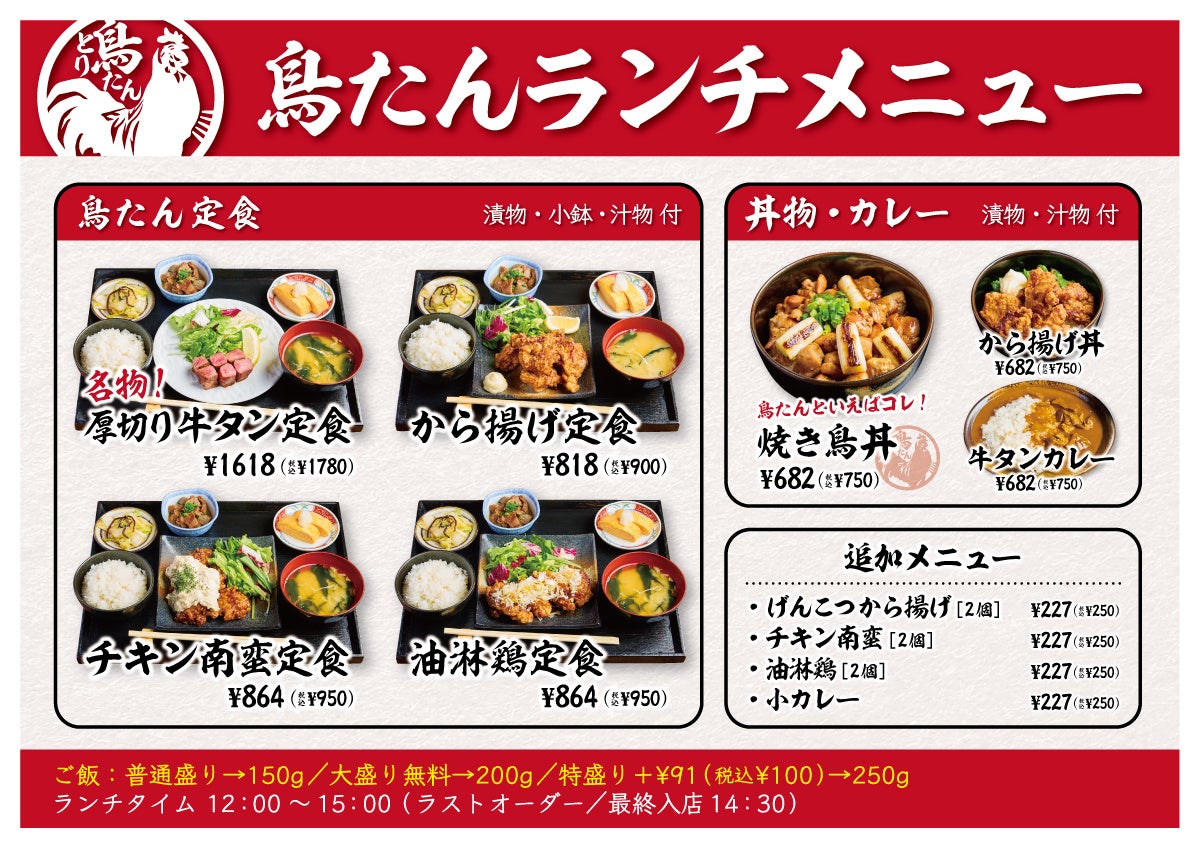 全国7店舗目となる「鳥たん 都島」では毎日12時から15時までランチ営業を行います。