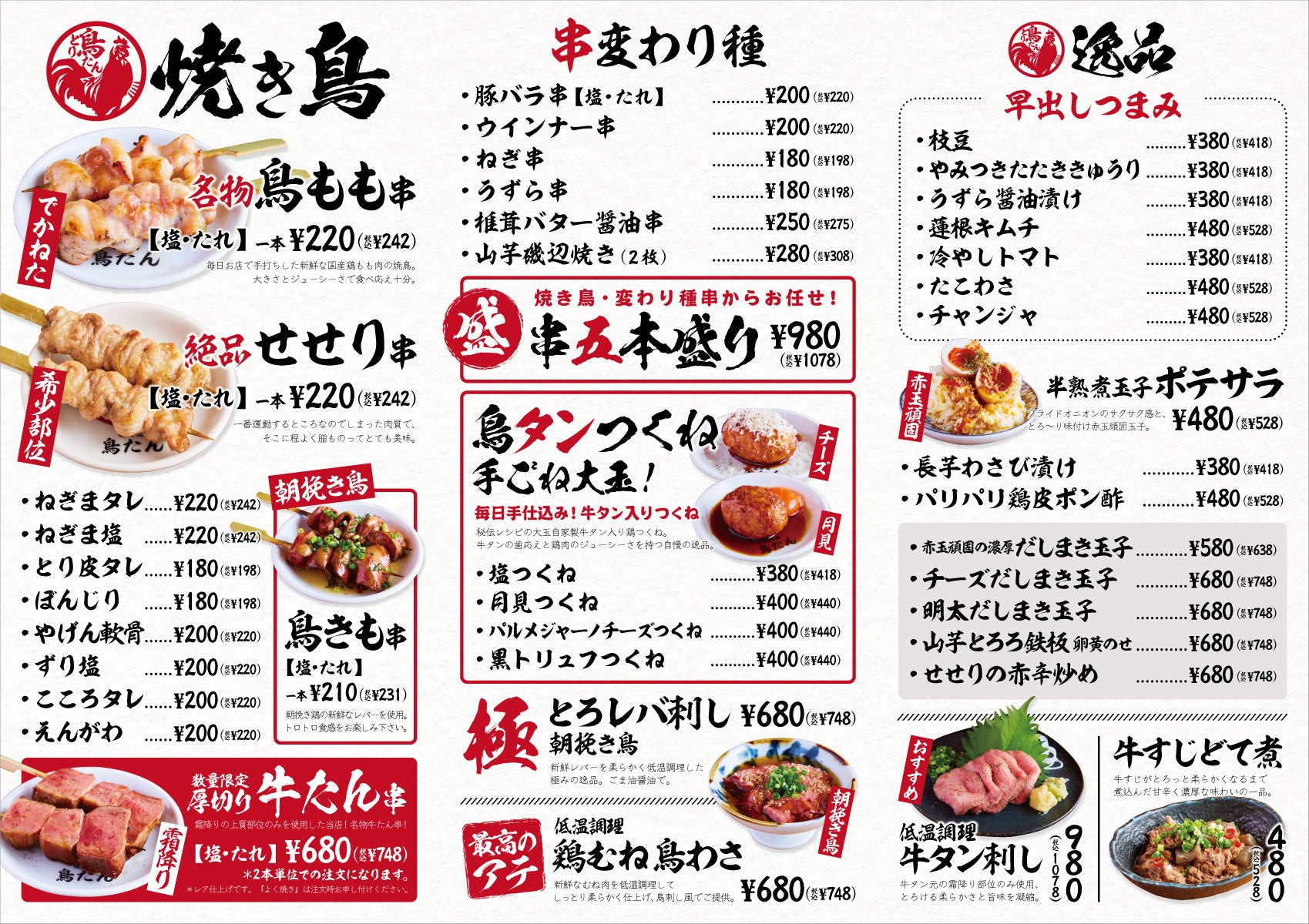 "焼鳥と牛タンが旨い店"をコンセプトにした「鳥たん」では国産朝挽き鶏を使った焼き鳥と美味しい牛タンが楽しめる焼き鳥屋です。素材そのものにこだわり、鮮度を大切にするために国産の朝挽き鶏を使用しています。焼き鳥は1本ずつ串打ちするために手間がかかりますが、その分、鳥本来の美味しさを損ねていないので非常に旨味が豊富です。また鮮度が高いからこそ、低温調理を施したレバ刺しや鶏むねなどの提供も可能になりました。鳥たん名物の1つである「牛タン」は独自のルートで仕入れることで比較的安価にお客様へ提供することができます。数量限定の「牛タン串」は1本の牛タンから極僅かしか確保できない、最も脂が乗って美味しいと言われる「タン元」の霜降りと呼ばれる上質な部位を使用して提供しております。こだわり抜いた「牛タン」は必食メニューになりますのでぜひご注文くださいませ。