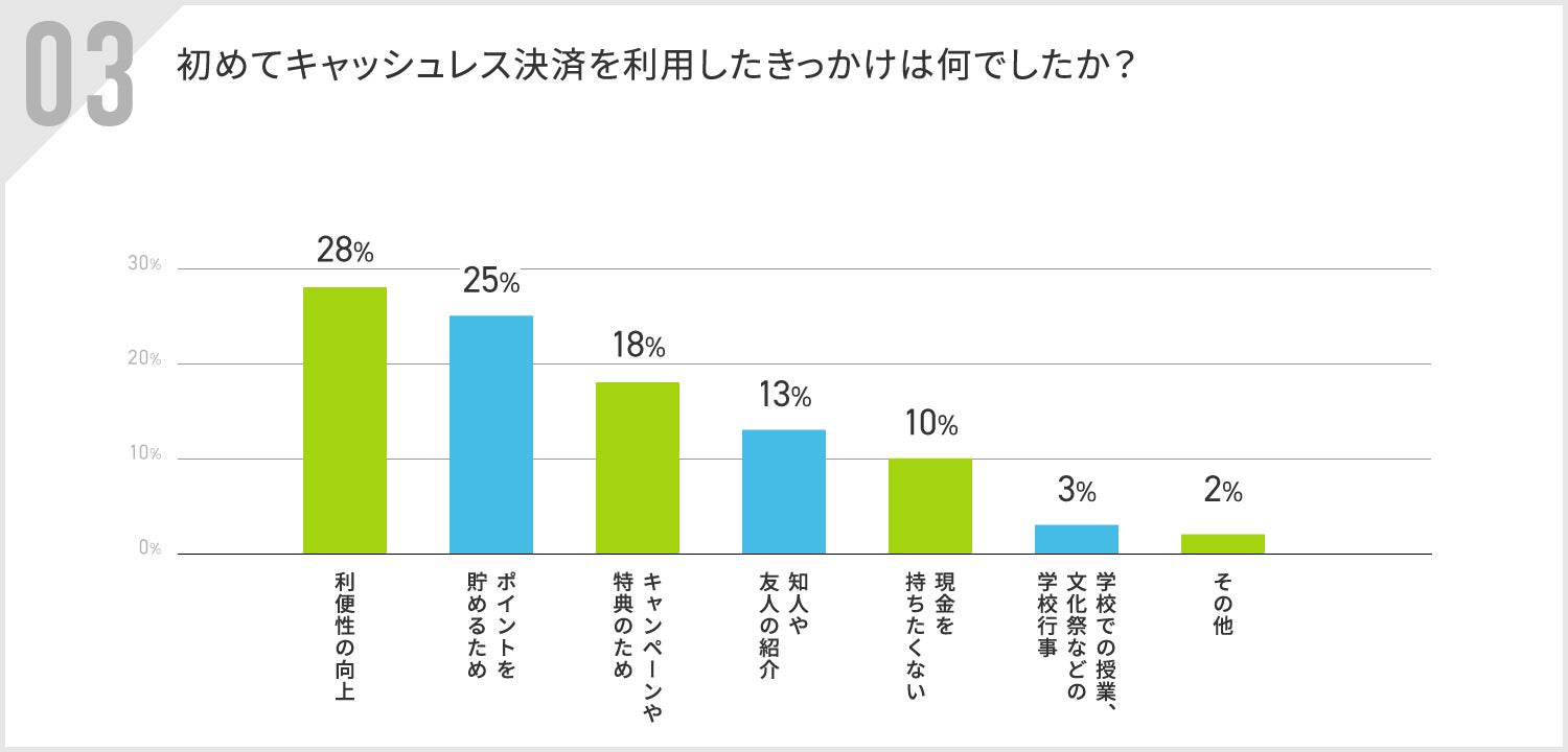 利用を始めたきっかけは全体で「利便性の向上」が最も多く、学生世代(15歳~24歳)でも「利便性の向上」が最多で「ポイントを貯めるため」が二番目に多い結果となりました。